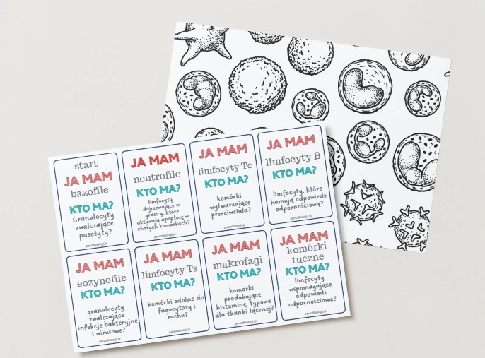 Materiał zawiera łącznie 16 kart (4 strony a4). Dotyczy pojęć związanych z układem odpornościowym, takich jak komórki odpornościowe, narządy, reakcje alergiczne itp.
