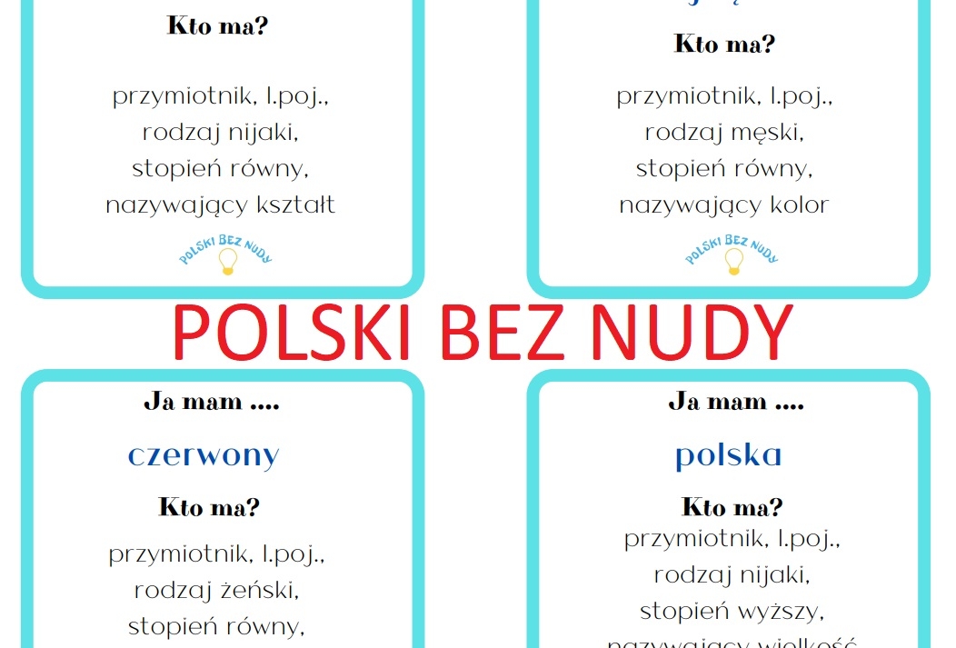 Gra polegająca na uważności i koncentracji, powtarzająca i utrwalająca wiadomości o przymiotniku. Gra składa się z 30 kart, ale jest też możliwa wersja skrócona. Forma zabawy powoduje, że uczniowie są zaangażowani i zainteresowani powtarzanym i utrwalanym materiałem.