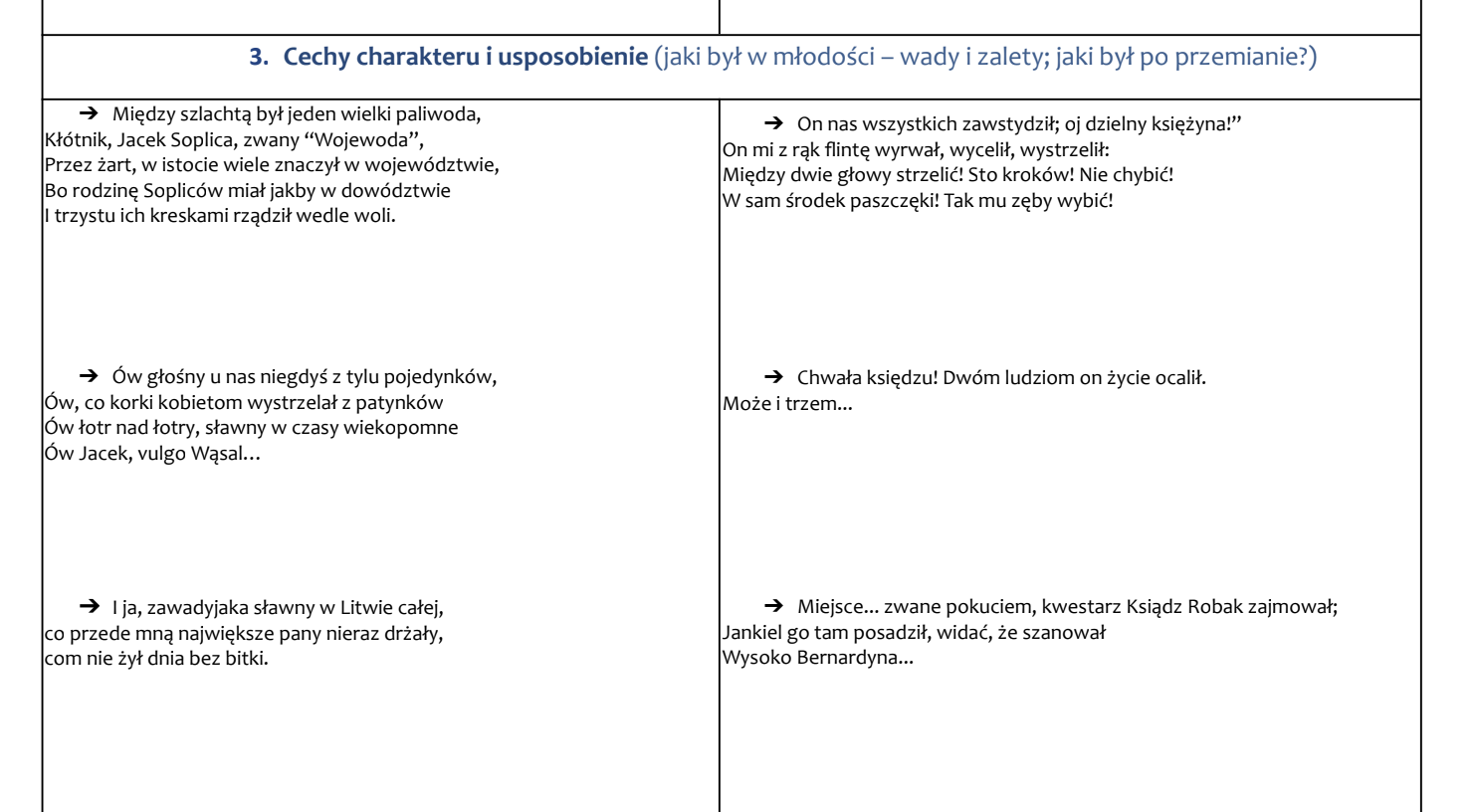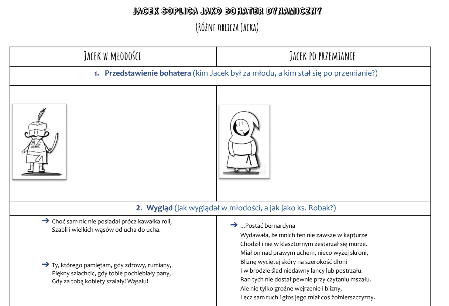 Karta pracy, która pozwala uczniom w sposób pogłębiony i uporządkowany przeanalizować postać Jacka Soplicy / księdza Robaka, jednego z najważniejszych bohaterów epopei narodowej Adama Mickiewicza. Materiał świetnie sprawdzi się w klasie 7 lub 8 szkoły podstawowej podczas omawiania lektury „Pan Tadeusz”.