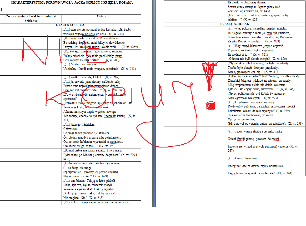 Proponuję tabelkę z uporządkowanymi cytatami do charakterystyki Jacka Soplicy. Cytaty dobrane są tak, aby uczeń mógł na ich podstawie nazwać cechy bohatera. Dobór cytatów układa się w sensowną całość, pomocną w charakterystyce bohatera dynamicznego.