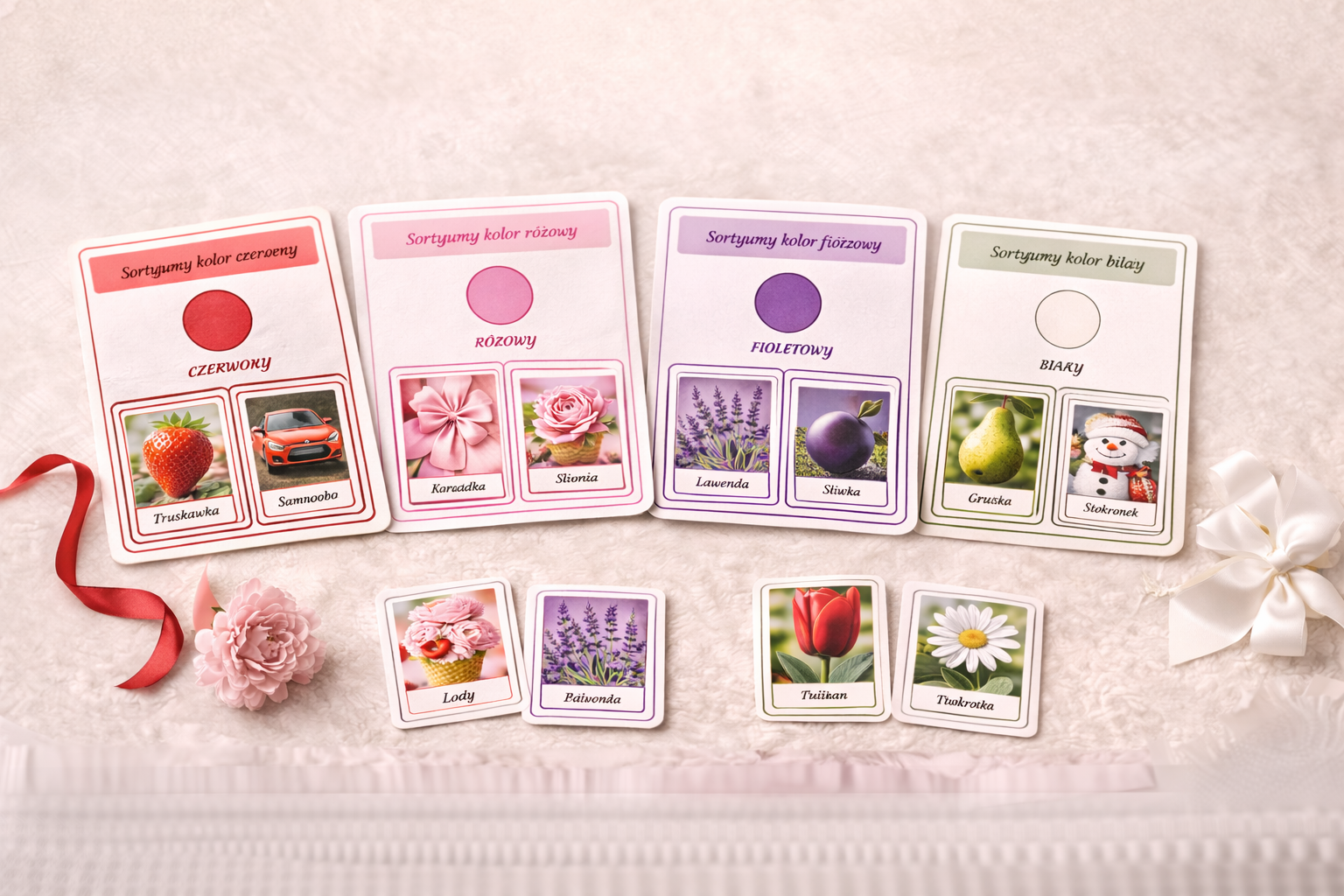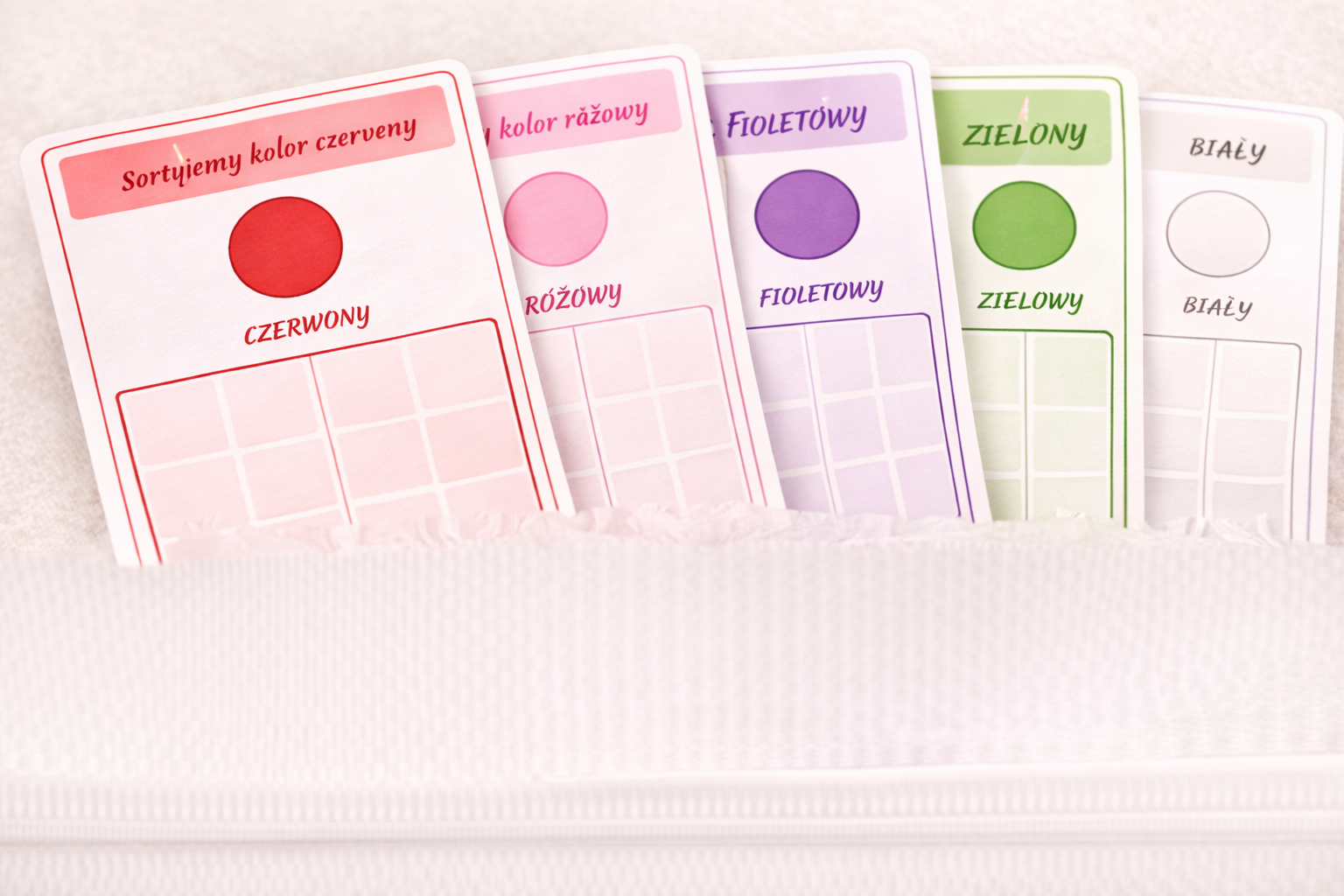 Kolory zostały dobrane tak, by dziecko mogło uczyć się przez obserwację i porównywanie. W zestawie znajdują się plansze do sortowania koloru: