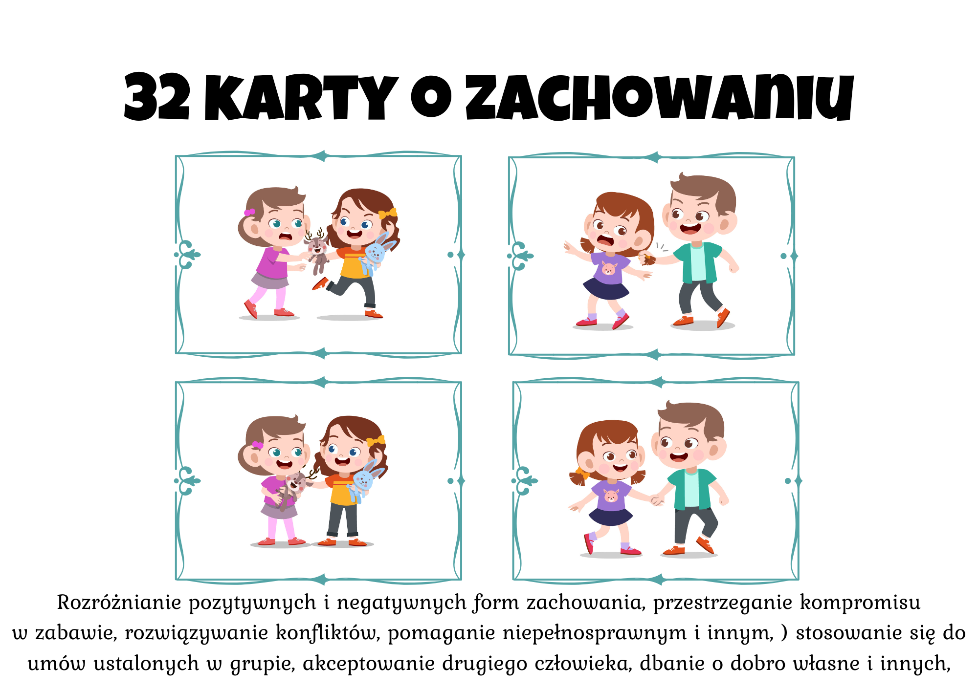 ✔️ 32 karty przedstawiające różne zachowania dzieci wobec innych.