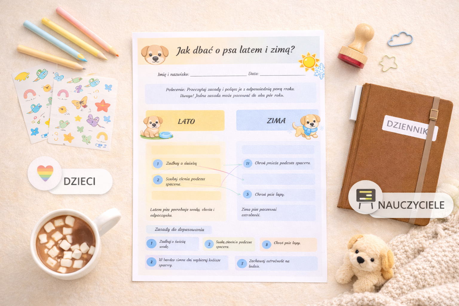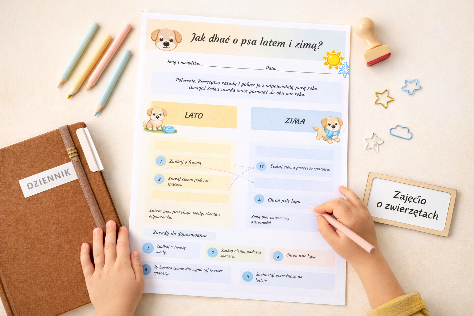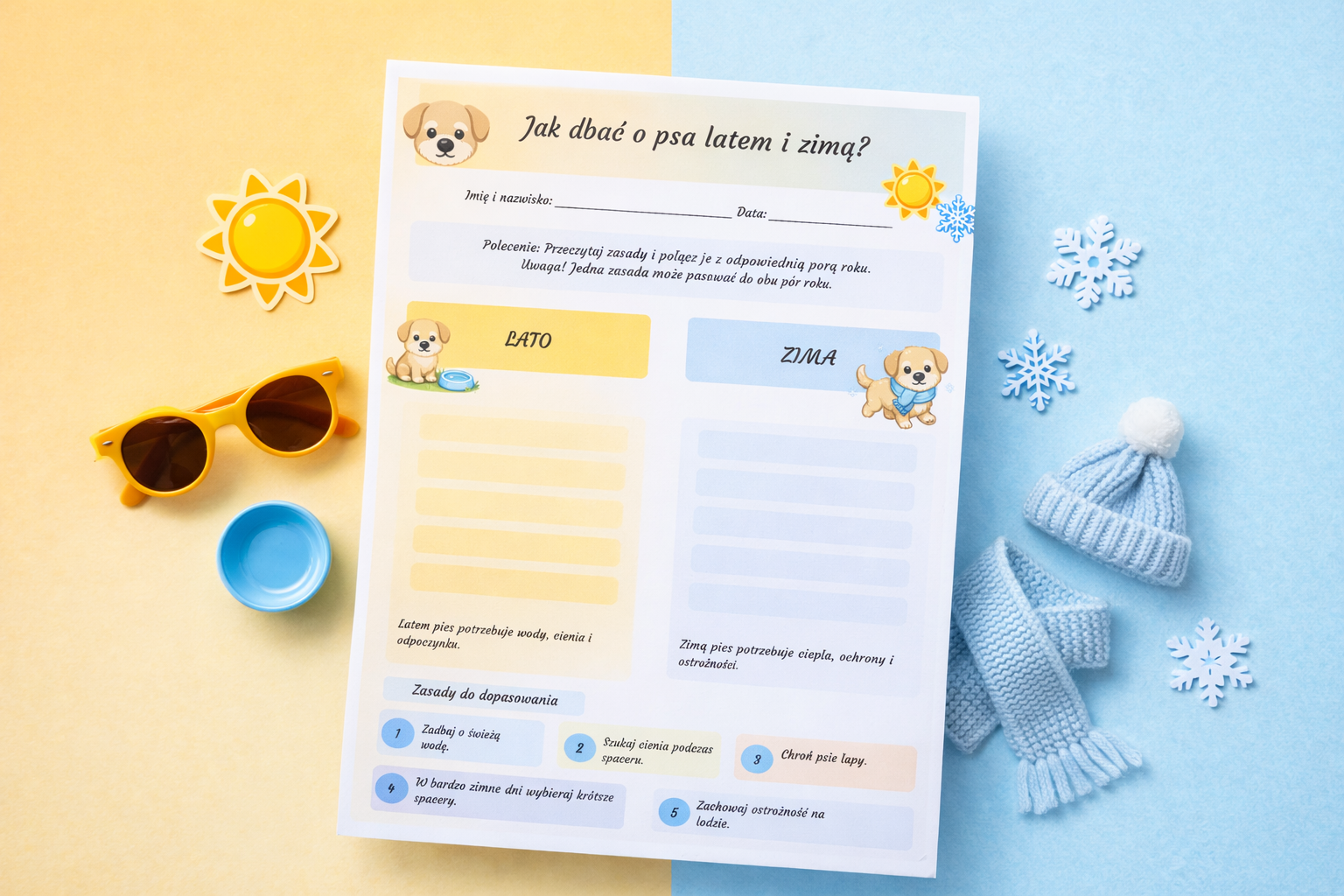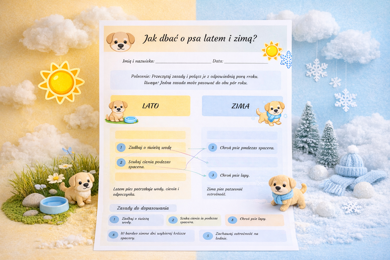 „Jak dbać o psa latem i zimą?” to materiał edukacyjny, dzięki któremu dzieci poznają podstawowe zasady opieki nad pupilem w różnych porach roku. Piękna grafika, czytelny układ i ciekawe zadanie sprawiają, że nauka staje się przyjemnością. Idealna propozycja dla nauczycieli i rodziców, którzy chcą łączyć edukację z ważnymi wartościami: troską, empatią i odpowiedzialnością. 🐶☀️❄️