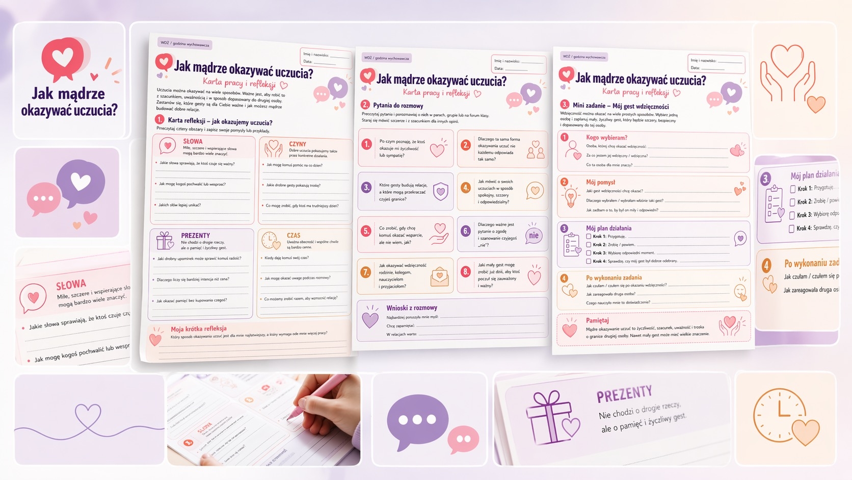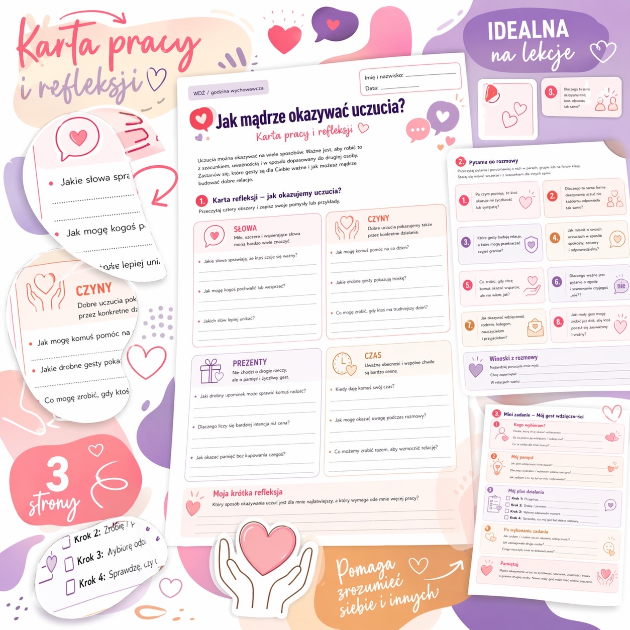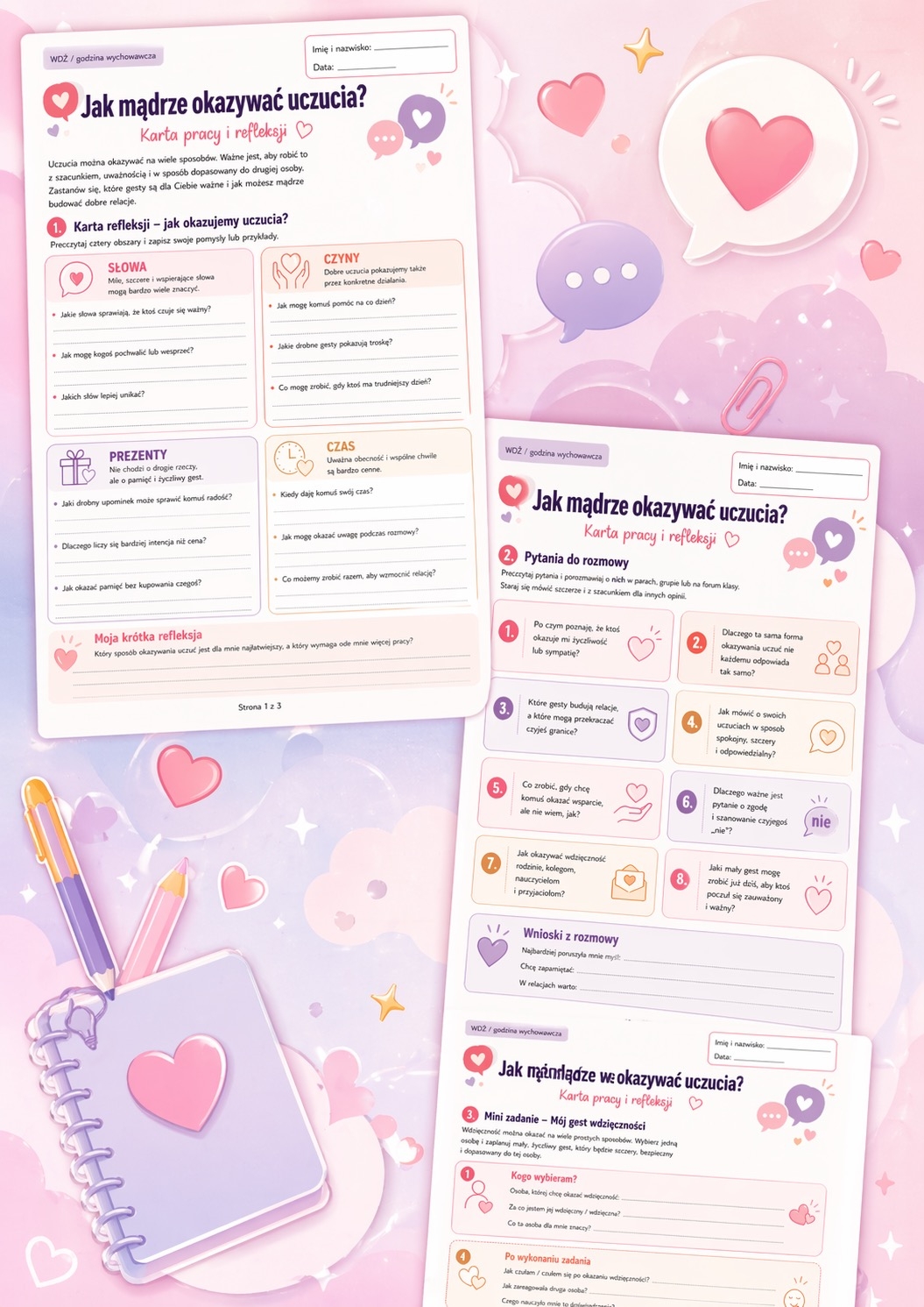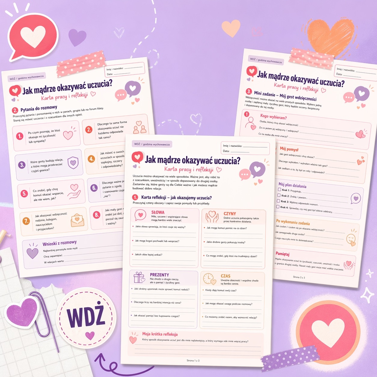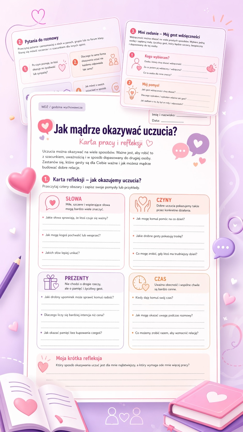 „Jak mądrze okazywać uczucia?” to 3-stronicowa karta pracy i refleksji przygotowana na WDŻ lub godzinę wychowawczą dla uczniów klas 6–8 oraz szkół ponadpodstawowych. Materiał pomaga młodzieży zastanowić się, w jaki sposób można okazywać uczucia w mądry, bezpieczny i pełen szacunku sposób. 🫶
