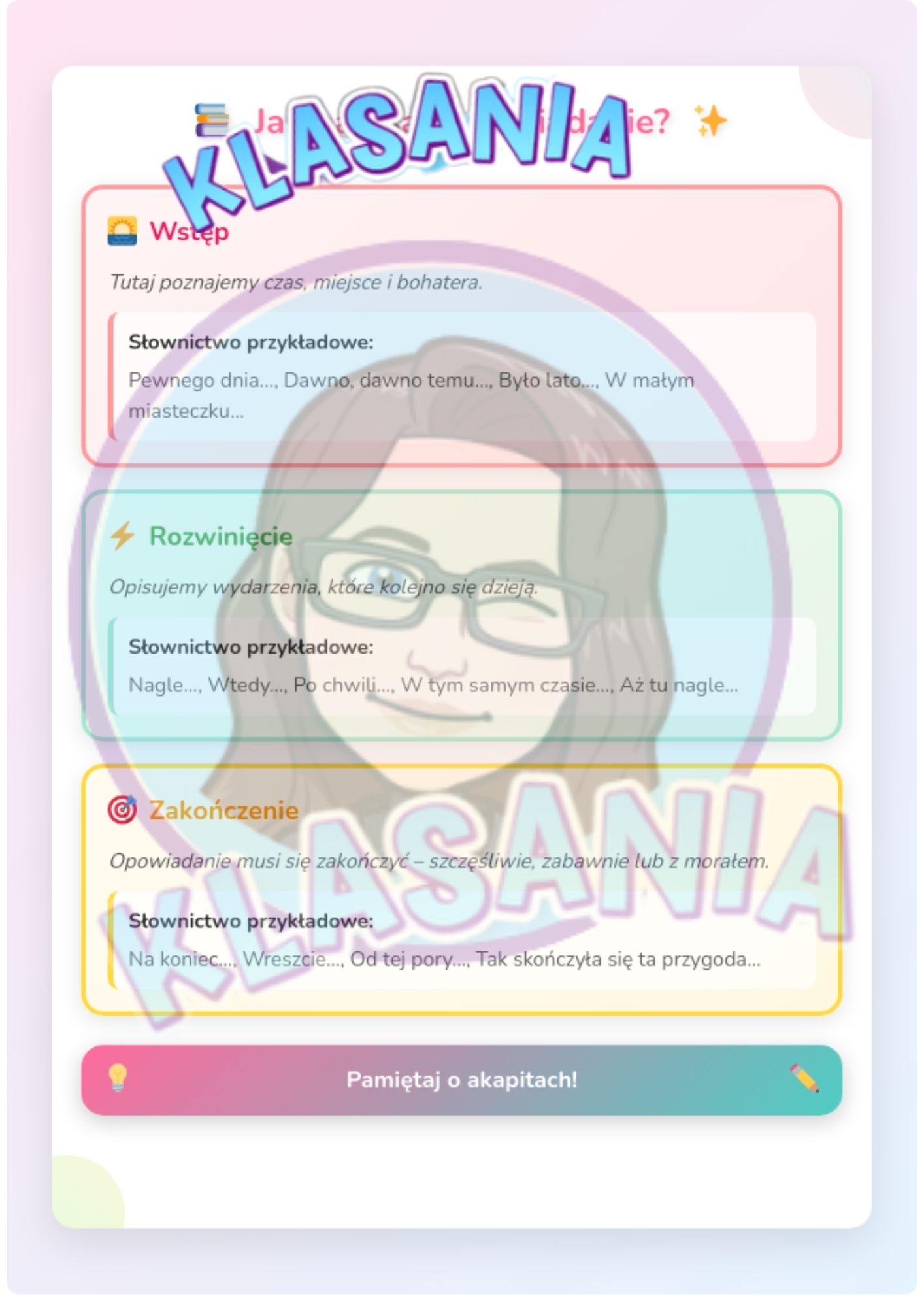 Prosta, przejrzysta wklejka dla uczniów, która przypomina, czym jest opowiadanie i jak je poprawnie napisać – z podziałem na wstęp, rozwinięcie i zakończenie, przykładowym słownictwem oraz przypomnieniem o akapitach. Wklejka została wykonana w Canvie.