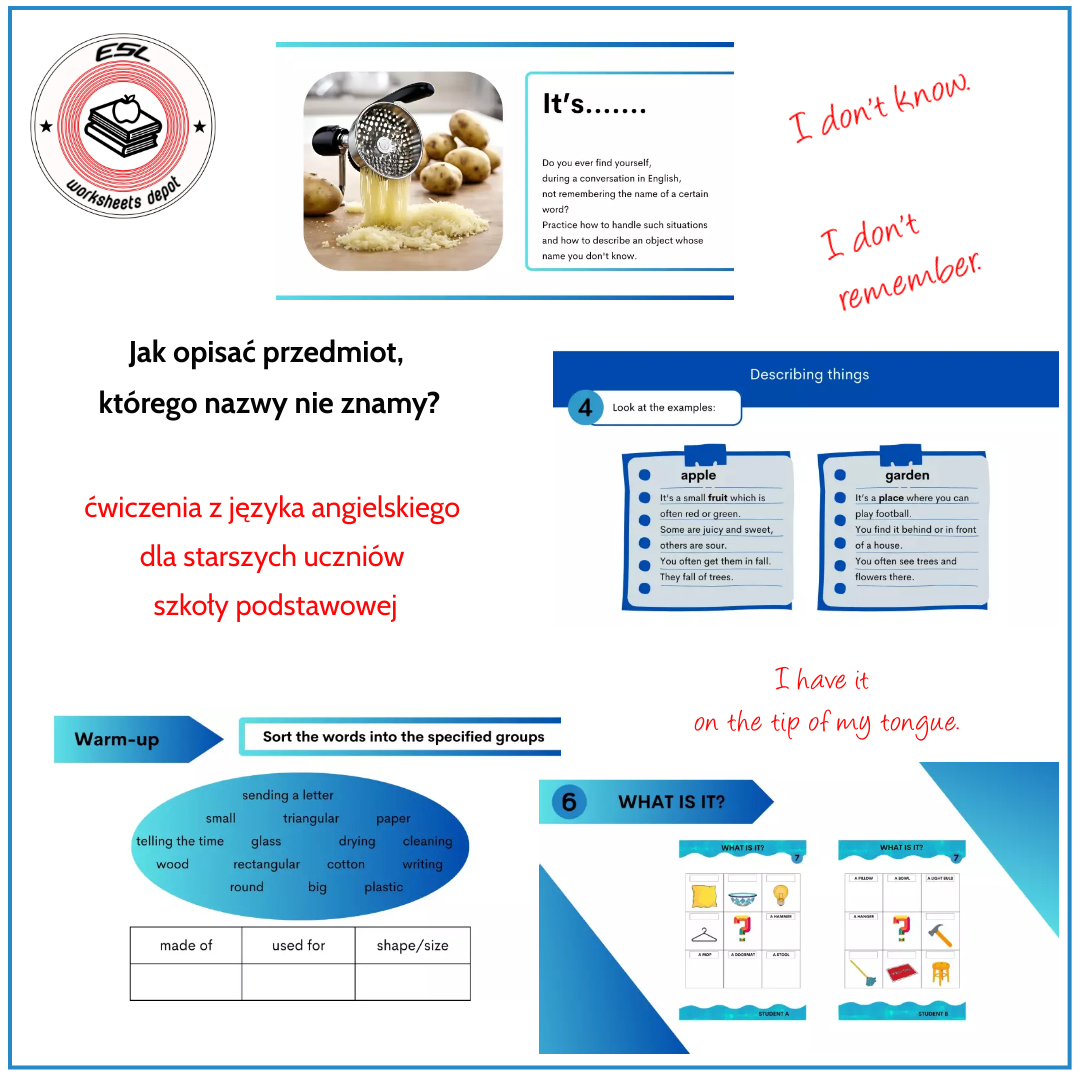 Dlatego proponuję serię ćwiczeń dla starszych klas szkoły podstawowej, które pomogą lepiej opisywać przedmioty, nawet jeśli nie pamiętamy ich nazwy. Celem jest zwiększenie pewności siebie w posługiwaniu się językiem podczas opisywania rzeczy codziennego użytku. Mam nadzieję, że te ćwiczenia przyniosą korzyści i sprawią, że opisywanie przedmiotów stanie się łatwiejsze.