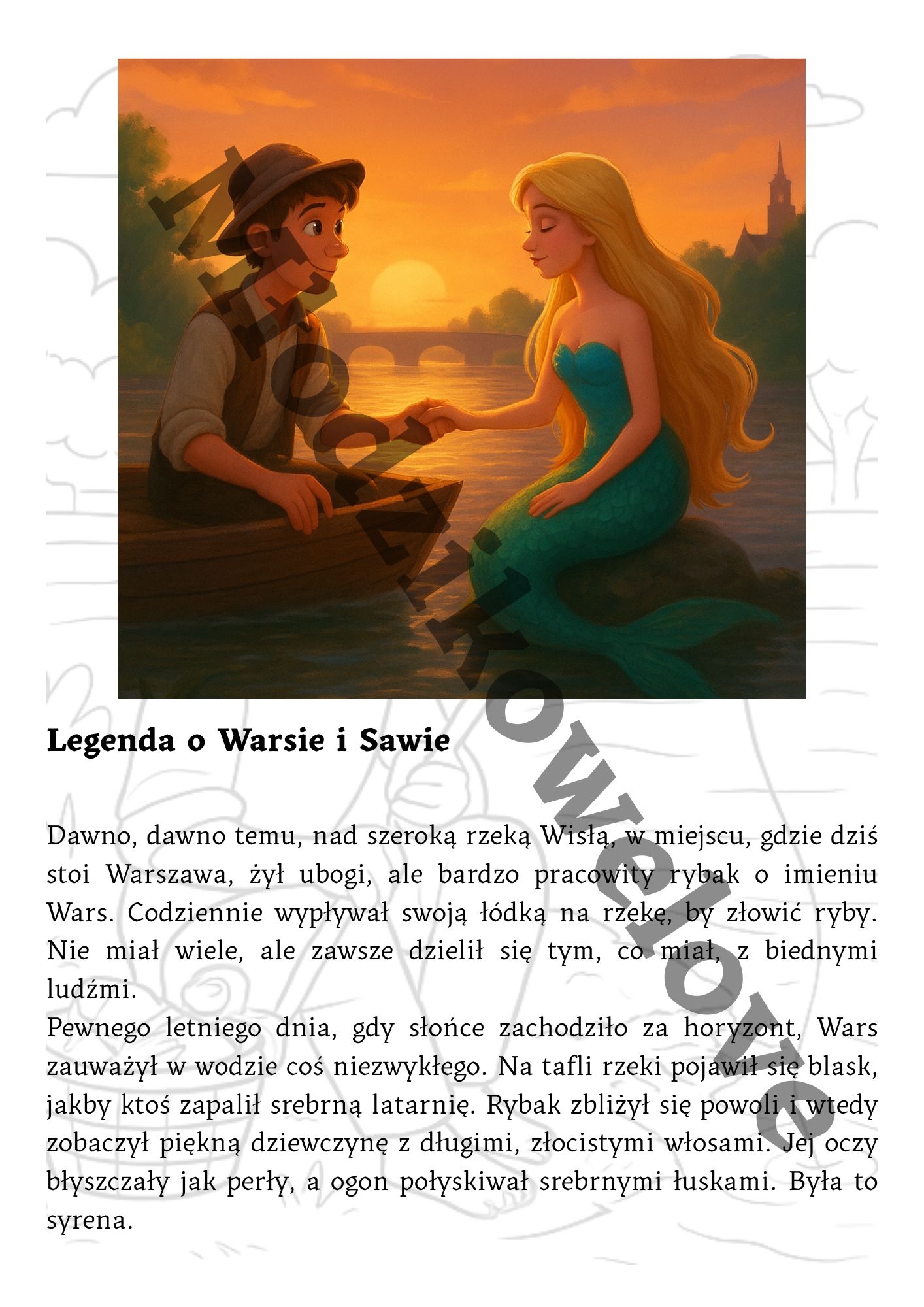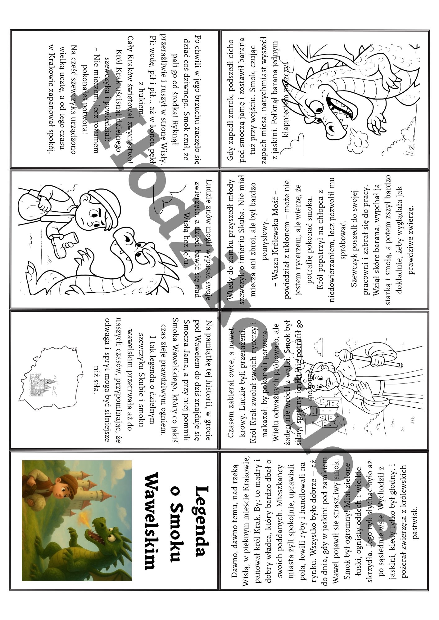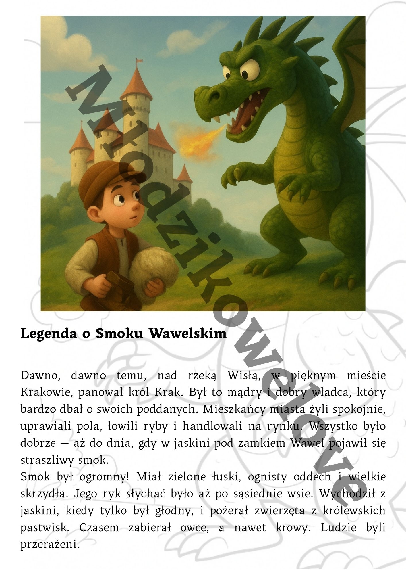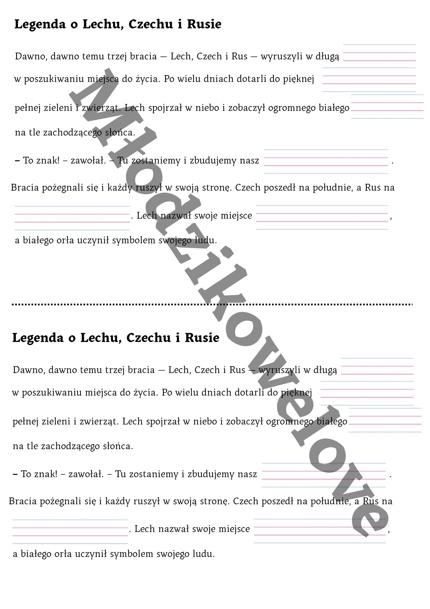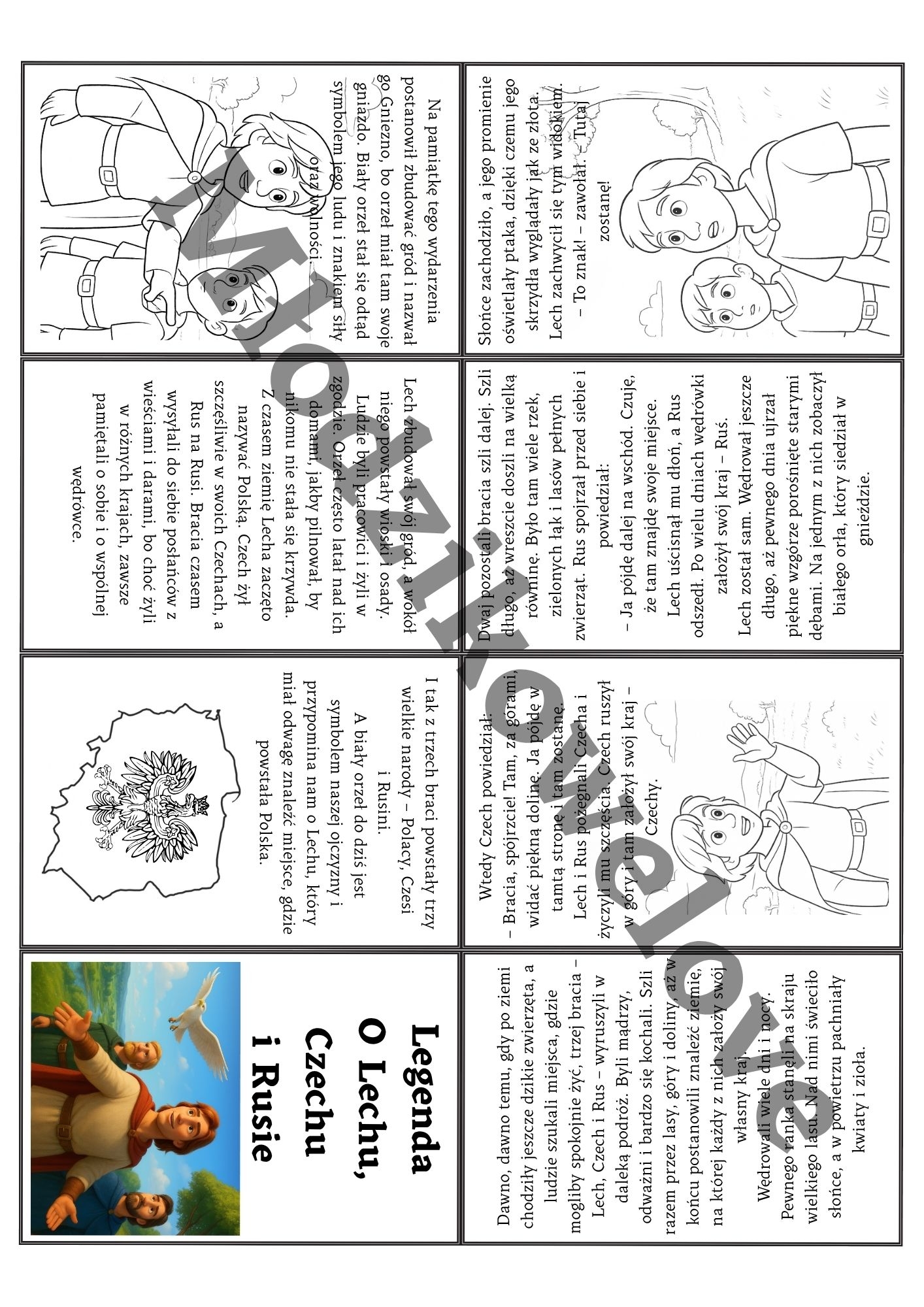 Materiał zawiera trzy znane polskie legendy: O Lechu, Czechu i Rusie, O Smoku Wawelskim oraz O Warsie i Sawie. Każdy tekst został opracowany w sposób krótki, przystępny i zrozumiały dla uczniów klasy 1–3, tak aby dzieci mogły poznać historię powstania państwa polskiego w ciekawy i przyjazny sposób.