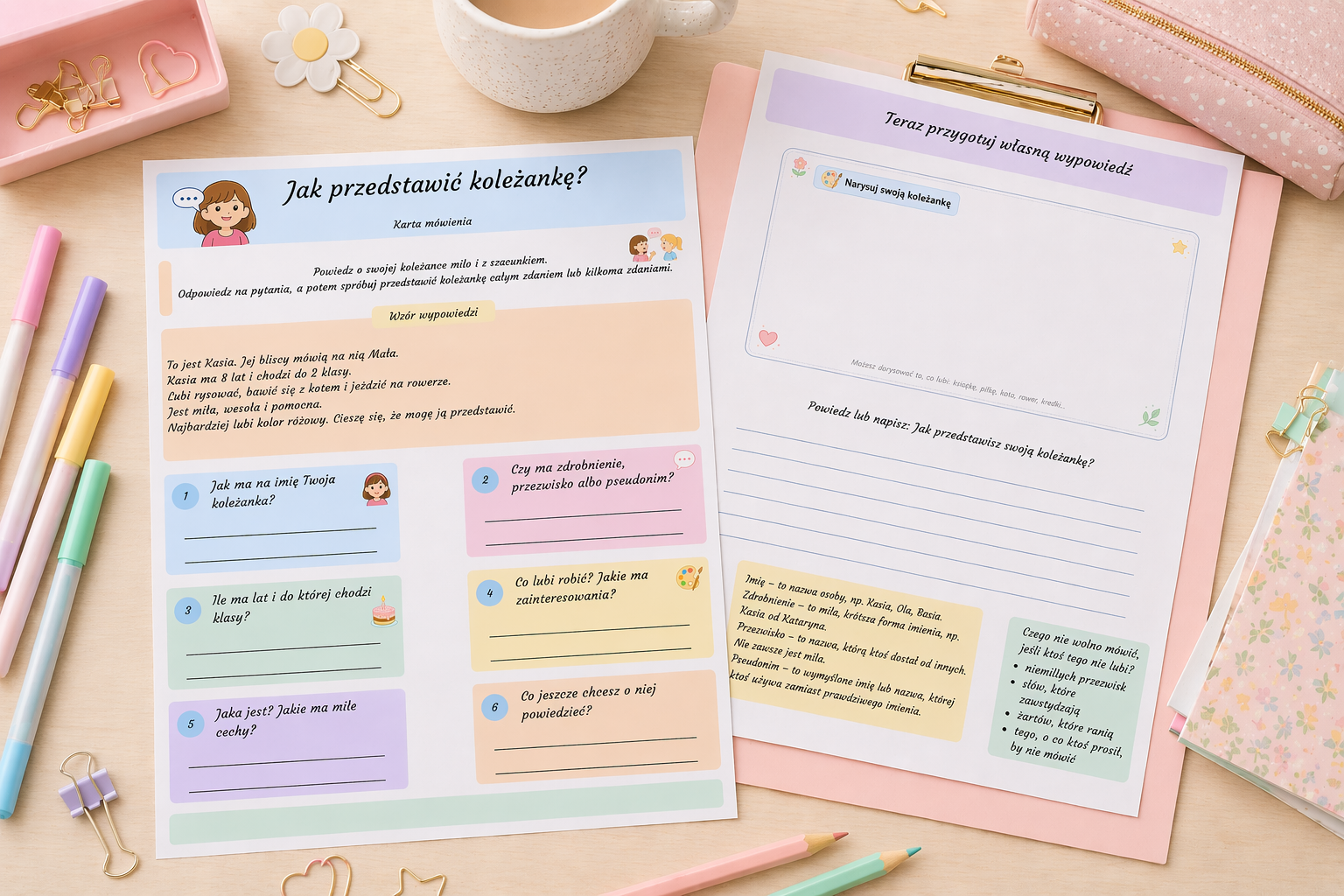 Na drugiej stronie () dodałam miejsce na własną wypowiedź oraz przestrzeń na rysunek 🎨 To świetna opcja dla młodszych uczniów – mogą nie tylko pisać, ale też wyrażać się poprzez ilustrację. Dodatkowo umieściłam krótkie wyjaśnienia pojęć (np. zdrobnienie, przezwisko), żeby dzieci lepiej je rozumiały.