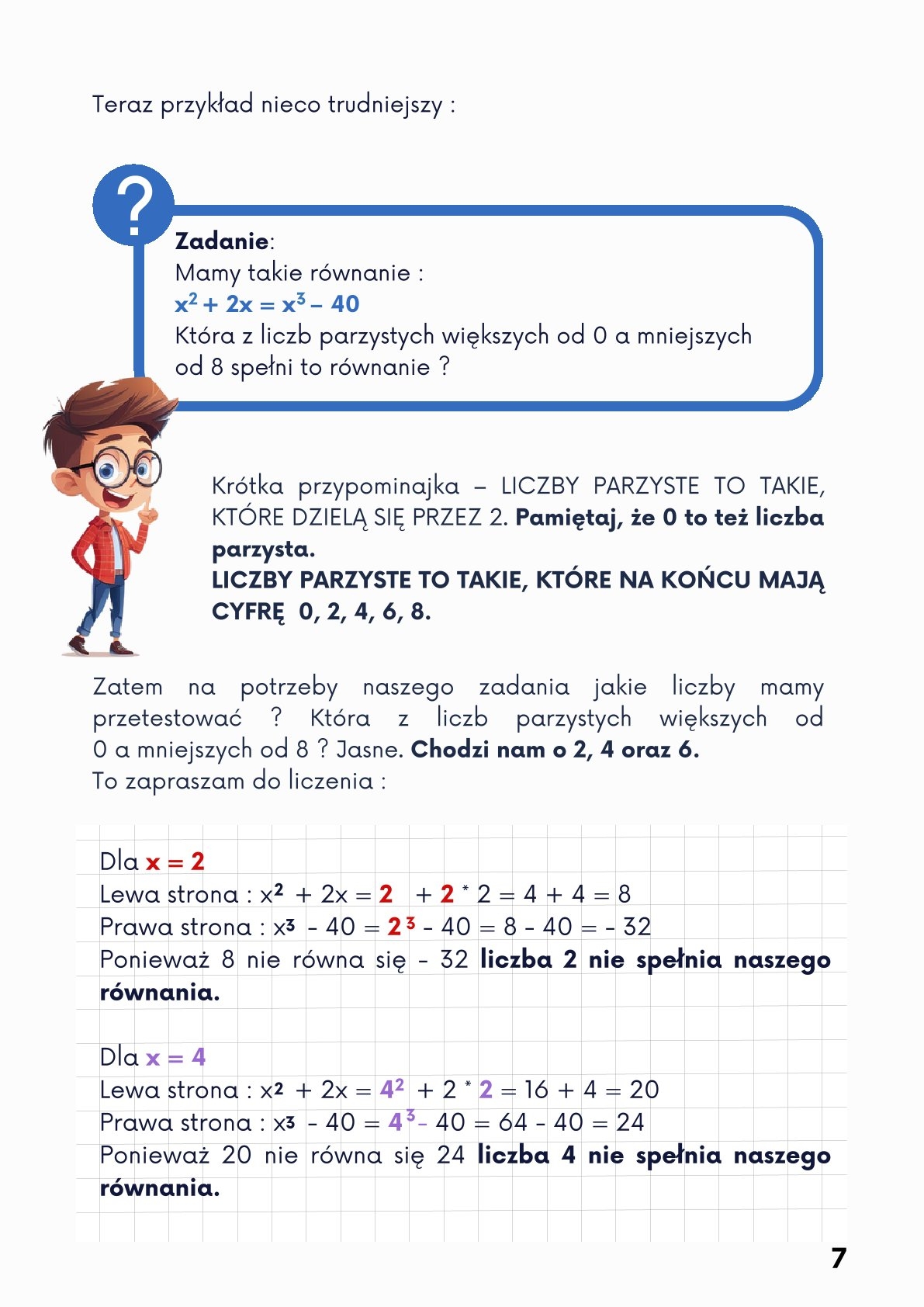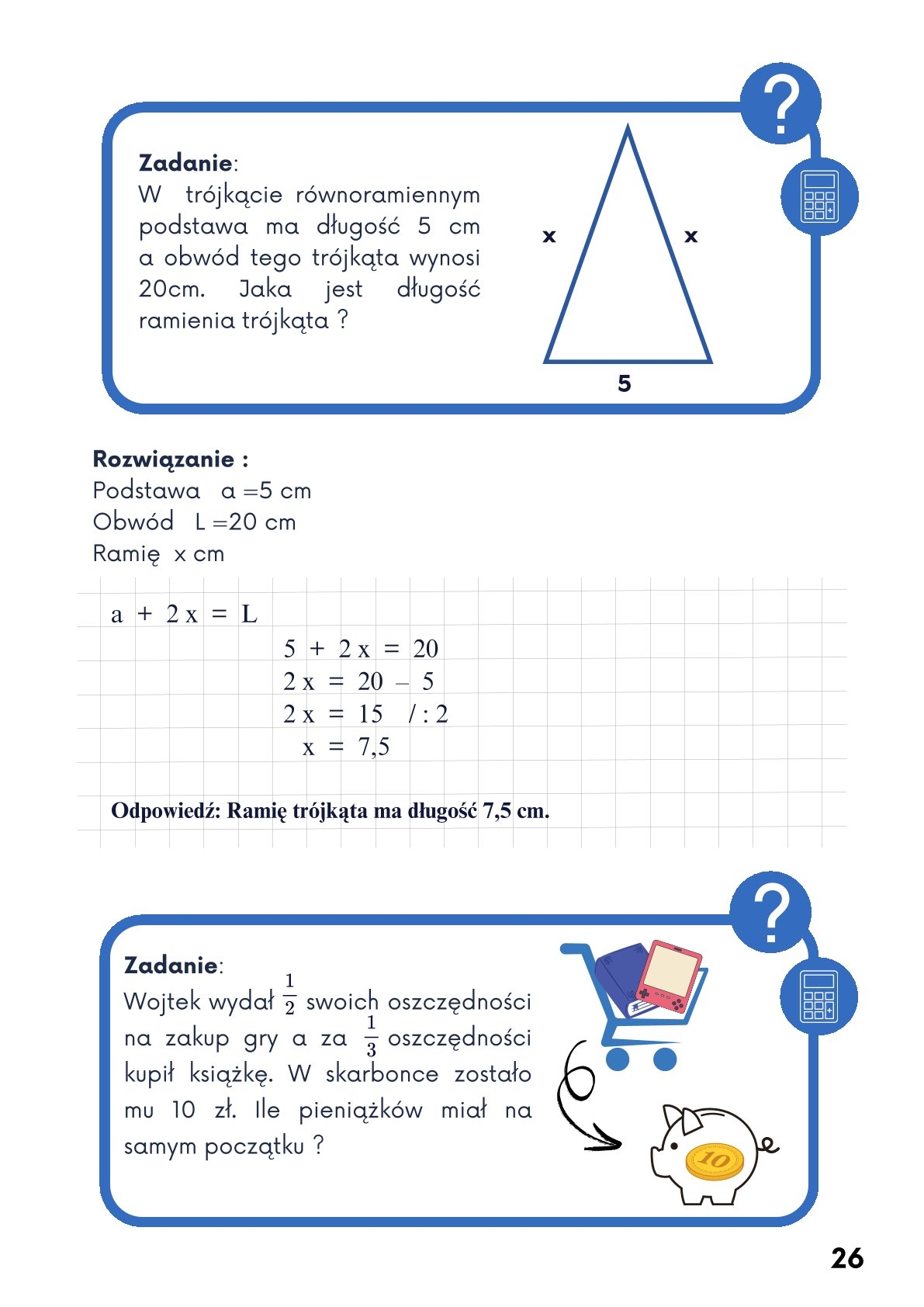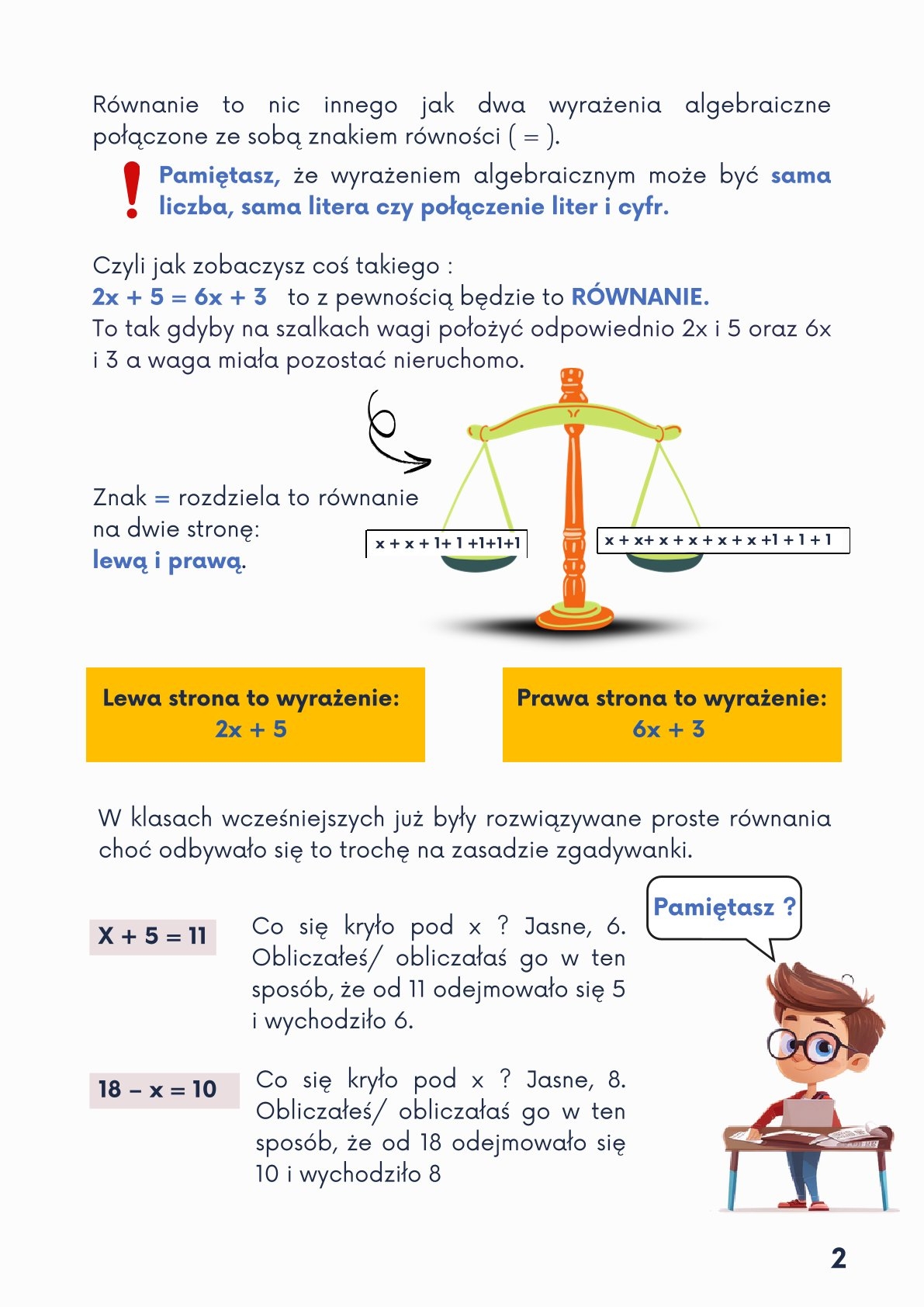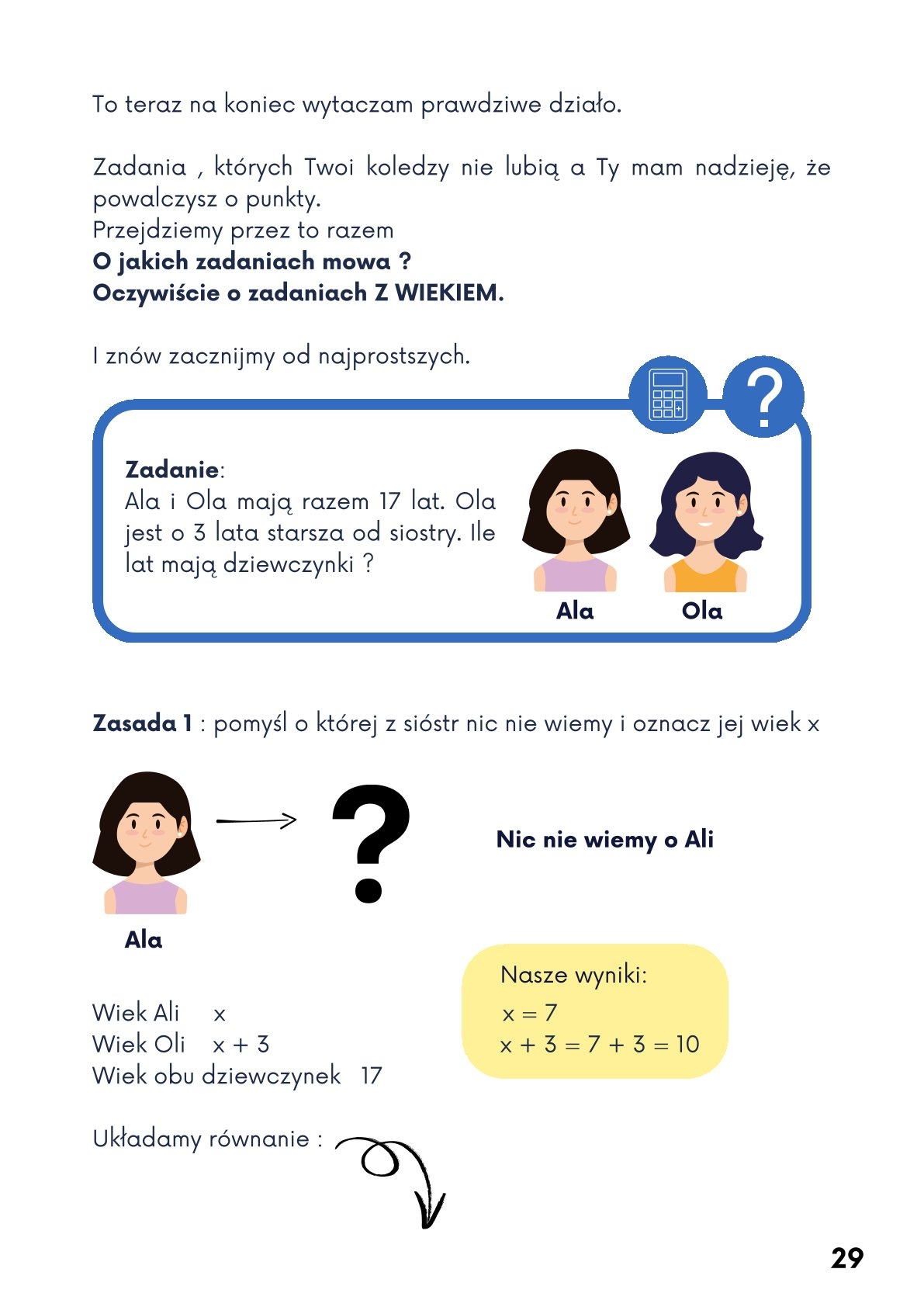 Jak rozwiązać równanie ? To często zmora uczniów. Obliczenie iksa u większości wywołuje strach. Pokażemy, że to wcale nie takie trudne jak wygląda. Rozwiązane i wytłumaczone pięknie przykłady od najprostszych po coraz trudniejsze. Zadania „ z wiekiem " też wydadzą się proste. Poznasz kilka sposobów na obliczanie niewiadomych. Zadania rozwiązane, zadania do samodzielnego rozwiązania i wreszcie zadania z egzaminów CKE. Wszystkie opatrzone odpowiedziami.