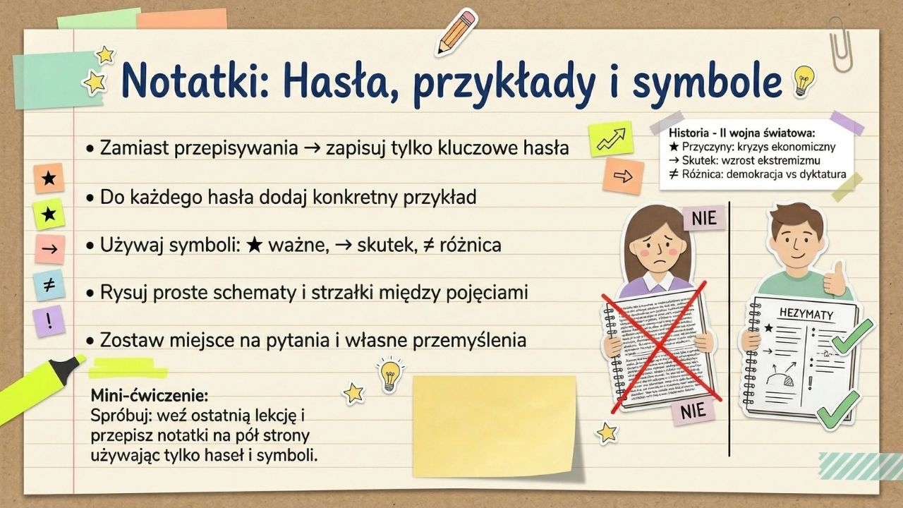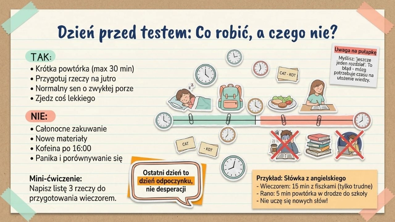 Jak pracować z materiałem? Możesz wydrukować plansze w A4/A3 i ułożyć z nich stałą gazetkę „Jak się uczyć”, a na lekcji omówić tylko wybrane moduły. W wersji warsztatowej najlepiej podzielić materiał na 3 krótkie spotkania: (1) cel + start + praca w małych porcjach, (2) powtórki 1–3–7 i testowanie, (3) notatki + sen/przerwy + stres przed sprawdzianem. Bardzo dobrze działa też „wdrożenie tygodniowe”: uczeń wybiera jedną zasadę (np. 25 minut pracy, telefon poza biurkiem, powtórka po 3 dniach) i sprawdza ją przez tydzień, a potem wraca do „Kodeksu ucznia” i wybiera kolejną.