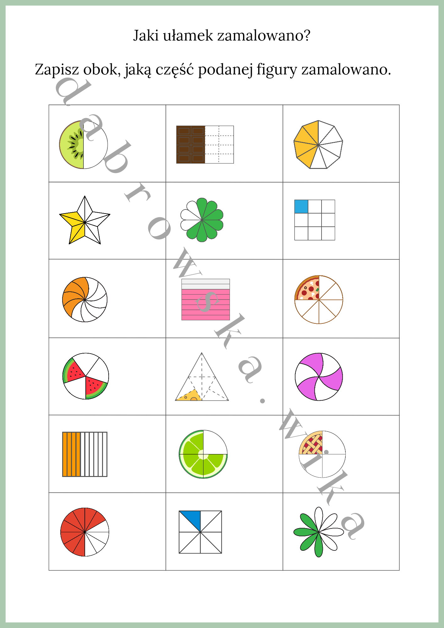 Znajduje się tutaj 18 kolorowych przykładów polegających na odczytaniu jaką część figury zamalowano i przedstawianie tej informacji w ułamku.