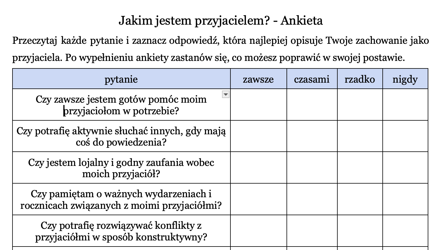 „Jakim jestem przyjacielem?” – Ankieta dla dzieci to angażujące narzędzie do pracy nad relacjami rówieśniczymi i samoświadomością emocjonalną. Dzięki prostym pytaniom dzieci mają okazję zastanowić się nad swoimi postawami, zachowaniem wobec innych i rolą w grupie. Idealna jako wstęp do rozmowy o przyjaźni, empatii i budowaniu pozytywnych więzi – na godzinę wychowawczą, zajęcia socjoterapeutyczne lub warsztaty integracyjne.