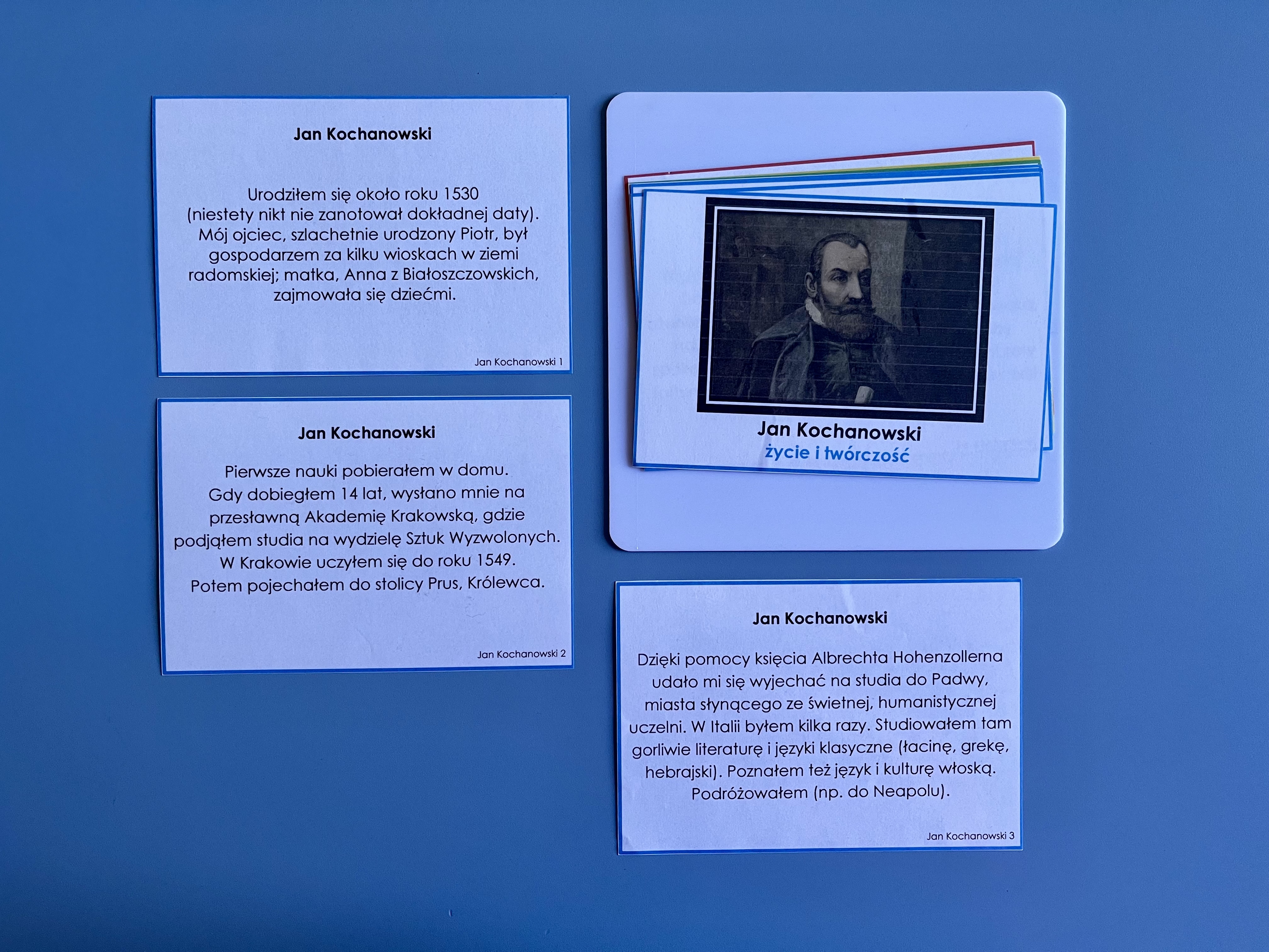 Karty Montessori, zawierające informacje na temat życia Jana Kochanowskiego. Tekst napisany w formie 1 os. l. poj. Jan z Czarnolasu sam przedstawia się uczniom, wybrane zostały najciekawsze informacje z biografii poety.