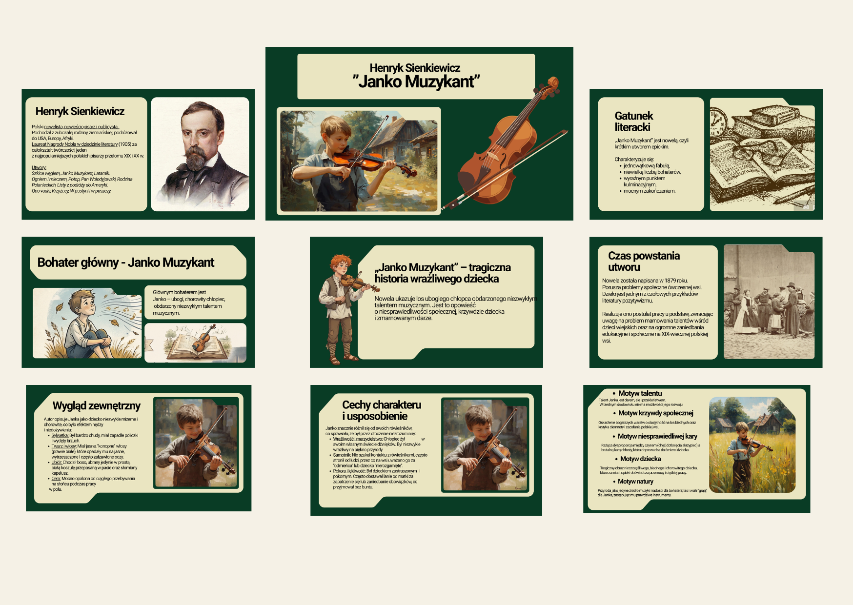 Prezentacja edukacyjna opracowana na podstawie noweli Janko Muzykant, przeznaczona do pracy z uczniami szkoły podstawowej (klasy 7–8). Materiał doskonale sprawdzi się podczas omawiania lektury, lekcji powtórzeniowych oraz przygotowania do sprawdzianu lub egzaminu. 📘 Prezentacja zawiera 21 slajdów, które w przystępny i uporządkowany sposób omawiają: - podstawowe informacje o utworze i autorze, - charakterystykę głównego bohatera, - problematykę i przesłanie utworu, -motywy literackie obecne w noweli, -cechy noweli jako gatunku, -zagadnienia pomocne w analizie i interpretacji tekstu. 🎯 Dlaczego warto? - materiał gotowy do użycia na lekcji, - przejrzysta forma ułatwiająca zrozumienie treści, - idealna do utrwalenia wiadomości o lekturze.