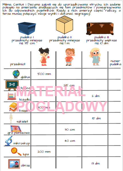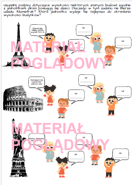 Karta pracy dotycząca jednostek długości oparta na historyjce o fikcyjnej miejscowości Jednostkowo i jej mieszkańcach: Milimie, Centusiu, Decymie, Metraku i Kilometraku. Dzieci w formie zabawy utrwalają zależności między jednostkami długości. Ćwiczą intuicję dotyczącą używania tych jednostek. Karta pracy do wykorzystania z całą klasą, w pracy w grupach lub na kółku. Zawiera wstęp, 4 zadania i odpowiedzi. Nie wymaga używania ułamków ani wyrażeń dwumianowanych.