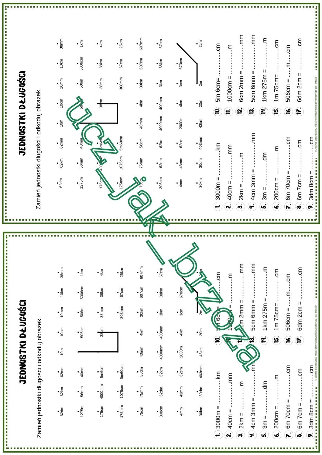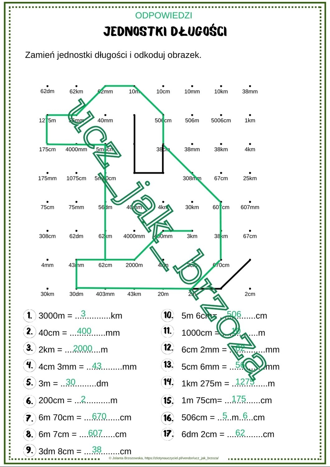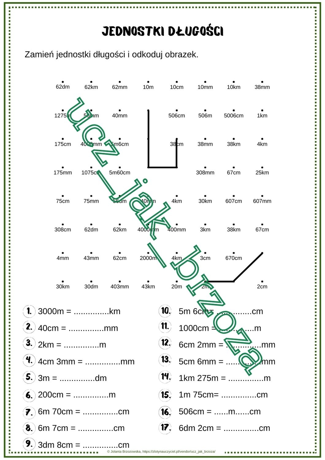 Karta pracy zawiera 17 przykładów utrwalających zamianę jednostek długości. Zadaniem uczniów jest odkodowanie ukrytego obrazka poprzez łączenie punktów z poprawnymi wynikami.
