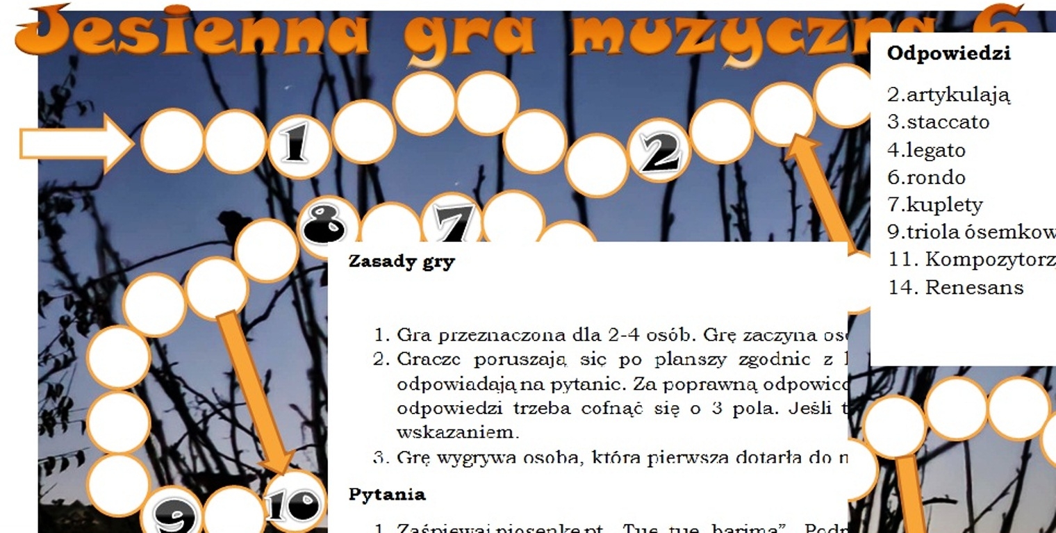Wprowadź do swojej lekcji muzyki w klasie 6 więcej ruchu, zabawy i… zdrowej rywalizacji! Gra została przygotowana w oparciu o treści z podręcznika „Lekcja muzyki” Wydawnictwa Nowa Era i zawiera różnorodne pytania oraz zadania muzyczne. Uczniowie będą: śpiewać piosenki, grać na flecie lub wyklaskiwać rytmy i odpowiadać na pytania teoretyczne. Idealna, by utrwalić materiał i zintegrować klasę. To świetna pomoc dydaktyczna, gotowa do użycia. Potrzebujesz kostki, pionki i dzwonki chromatyczne. Zapraszam do zakupu.
