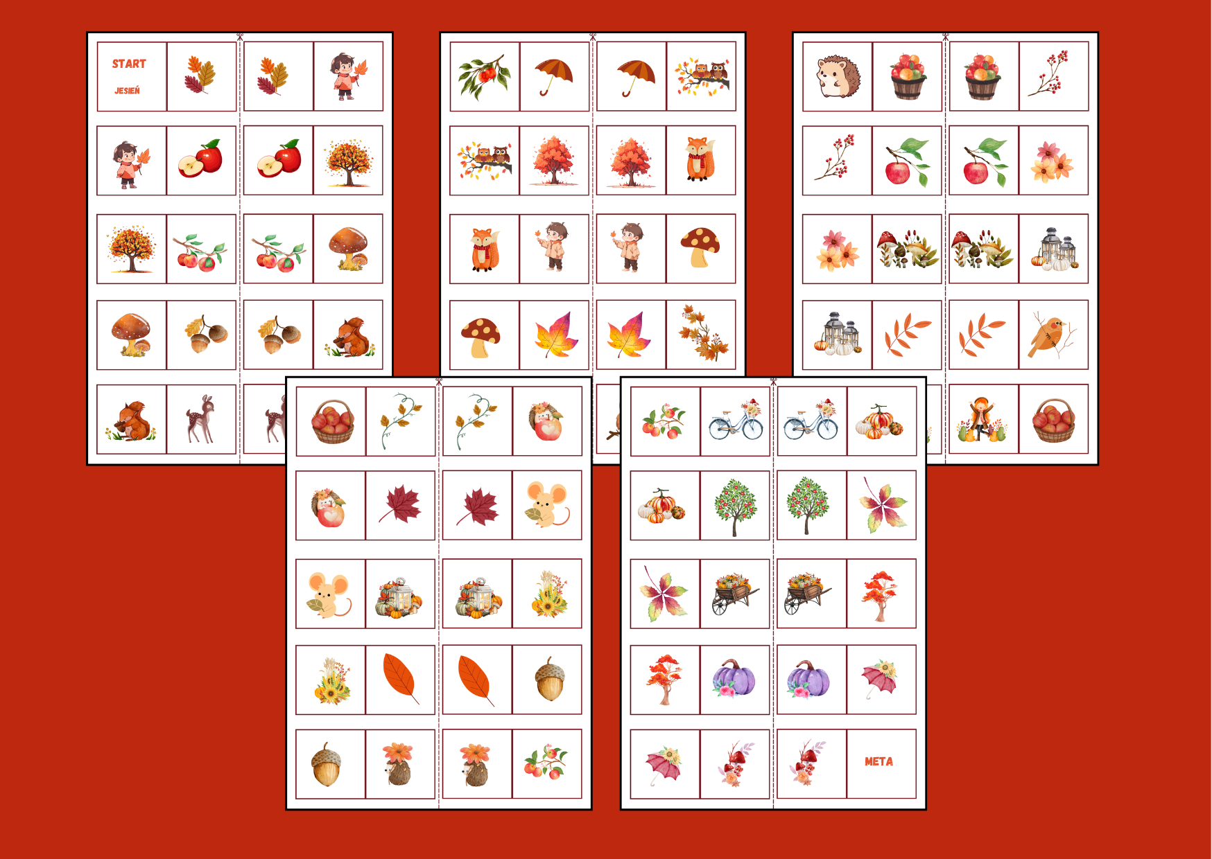 Domino zawiera 5 kart po 10 karteczek domina., na których znajdują się obrazki kojarzące się z jesienią.