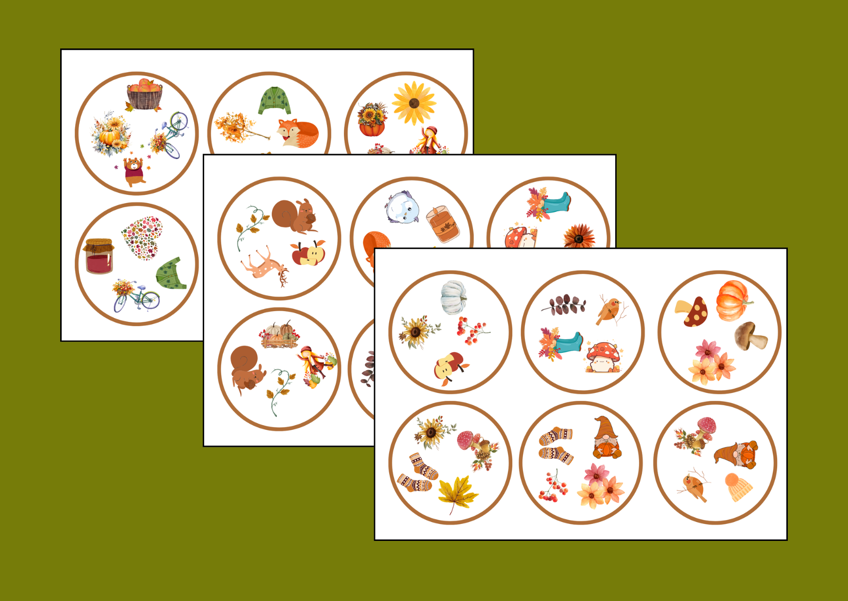 Zestaw zawiera 6 kart w wersji kolorowej. Na każdej karcie znajduje się 6 kół z obrazkami kojarzącymi się z jesienią. Po wycięciu materiał można zalaminować, aby dłużej służył. Można je wykorzystać na lekcji do ćwiczeń redakcyjnych, gramatycznych czy ortograficznych.