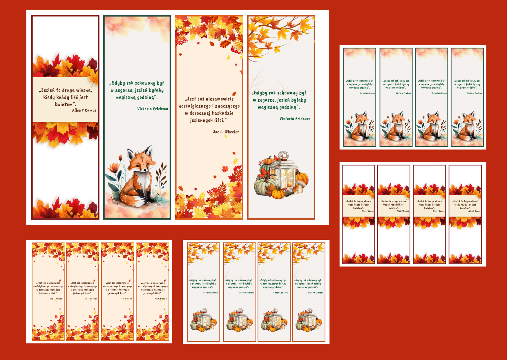 4 wersje zakładek do książek w jesiennym klimacie. Po wydrukowaniu i wycięciu zakładki warto zalaminować ( ewentualnie wydrukować na grubszym papierze).