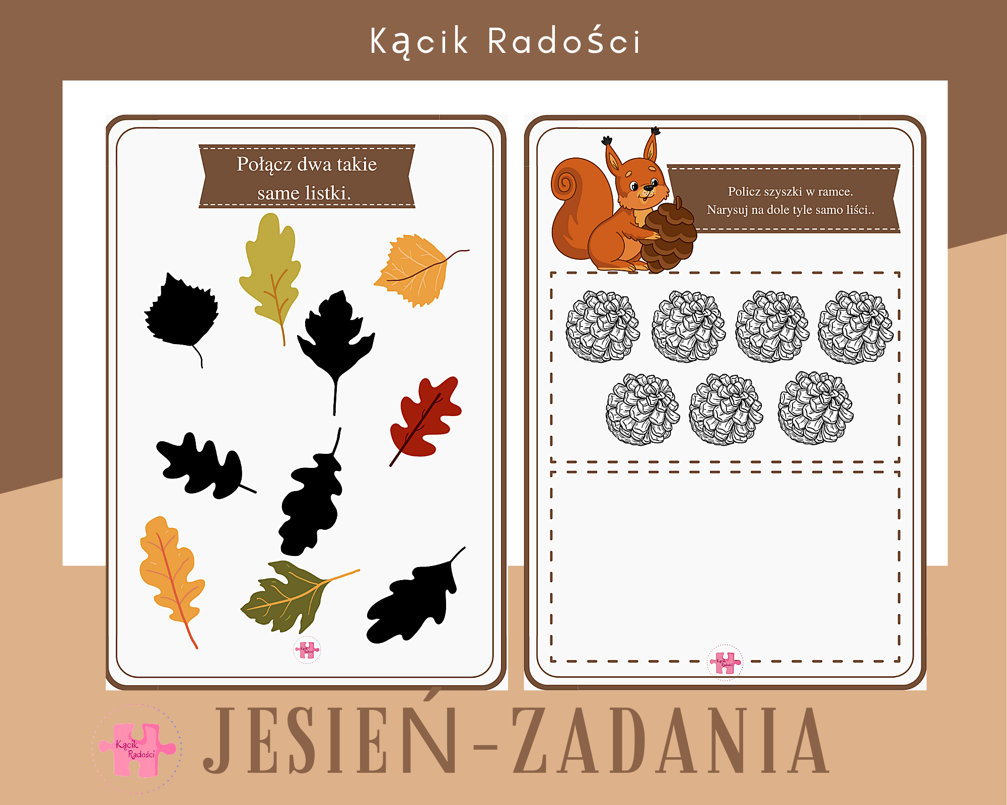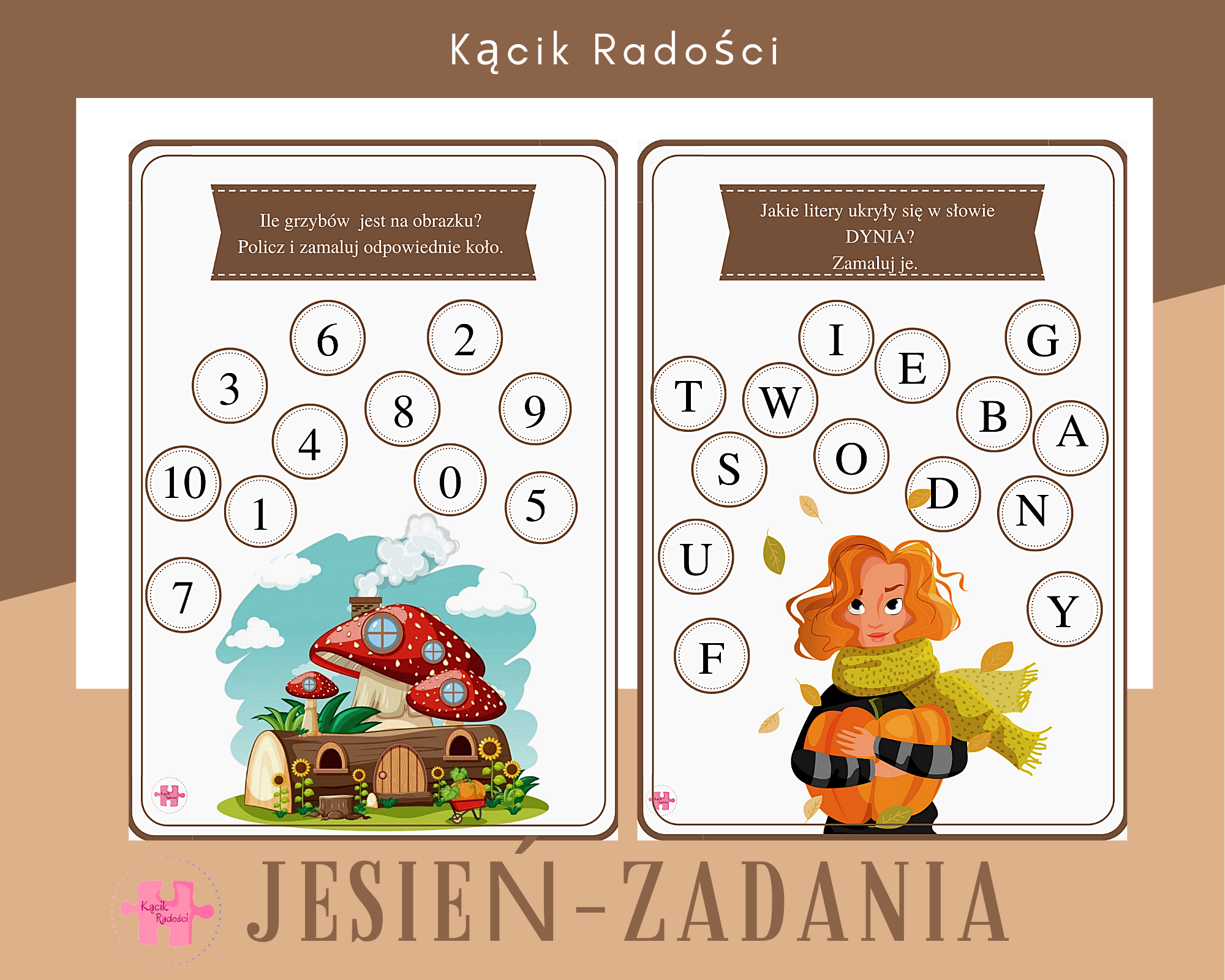 Karty pracy utrzymane są w jesiennej kolorystyce. Wśród zadań znajdują się między innymi karty pracy do liczenia, rysowania, rozwiązywania.