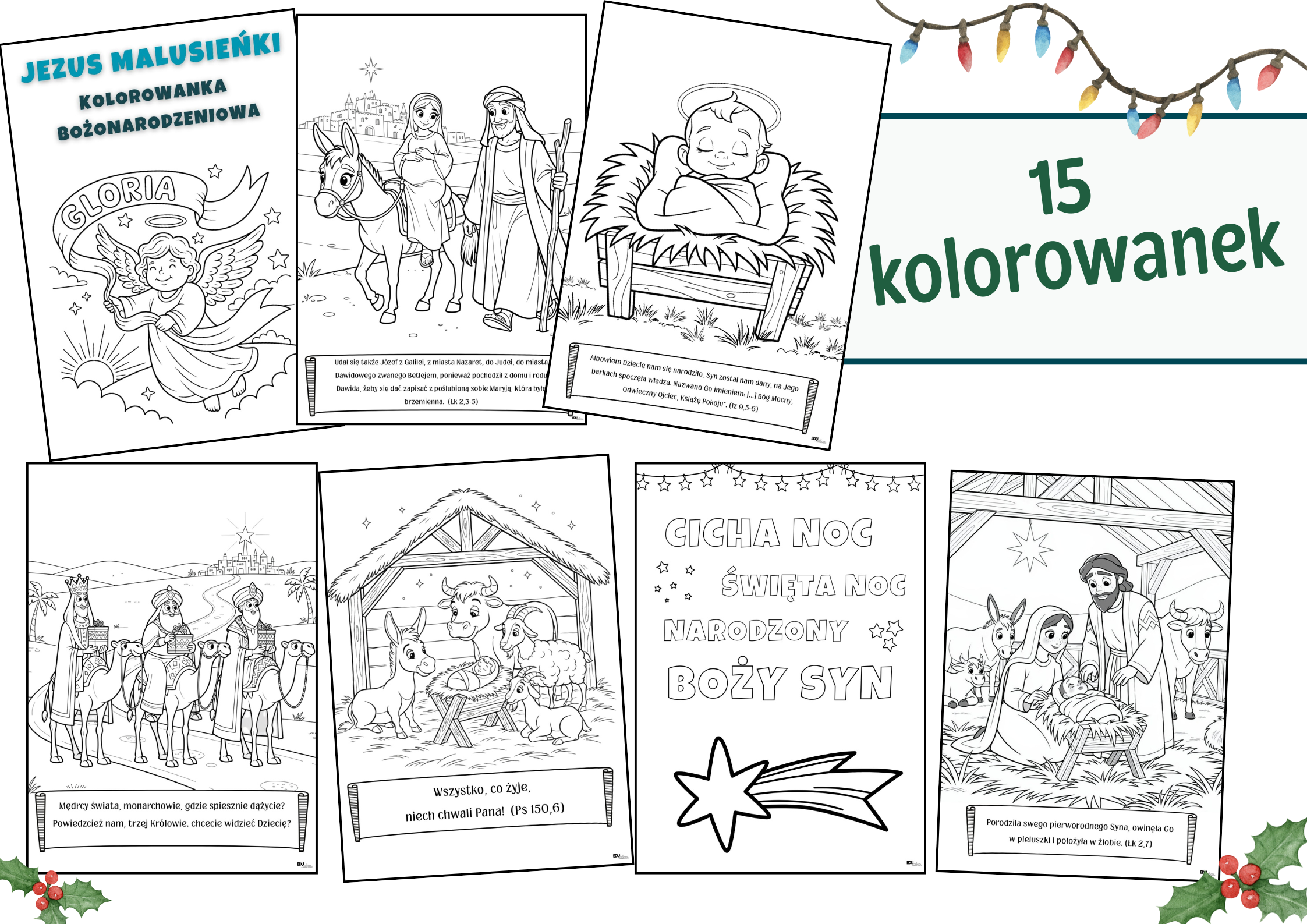 W zestawie znajdziesz 15 pięknych ilustracji, inspirowanych scenami Bożego Narodzenia, m.in. Świętą Rodzinę, Anioła zwiastującego, pasterzy, Mędrców ze Wschodu i motywy świąteczne. Prawie każdej kolorowance towarzyszy cytat z Pisma Świętego, kolędy lub modlitewnej tradycji, dzięki czemu materiał świetnie wpisuje się w tematykę religijną i edukacyjną.