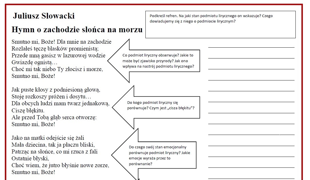 Zapraszam do skorzystania z karty pracy do wiersza J. Słowackiego "Hymn o zachodzie słońca na morzu". Zawiera ona pytania interpretacyjne do każdej ze strof oraz propozycję odpowiedzi. Umożliwia dokładną pracę z tekstem i rozwijanie kompetencji analityczno-interpretacyjnych.