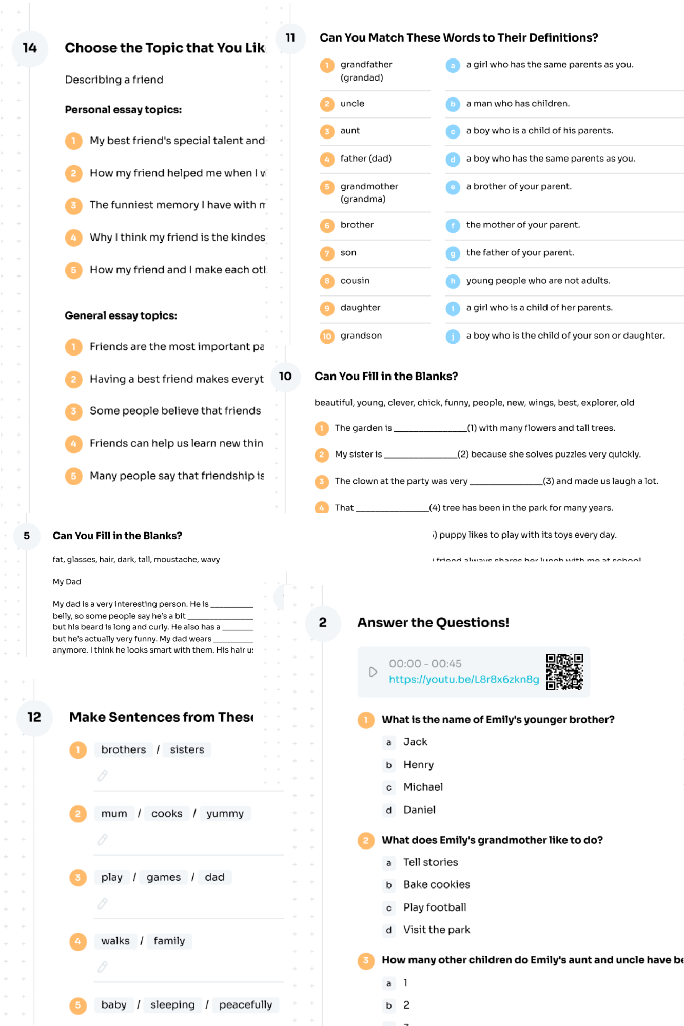 Materiał został opracowany na podstawie działu pierwszego z podręcznika Junior Explorer 4. Całe słownictwo z tego działu w postaci testów możesz znaleźć tutaj. Niniejszą kartę pracy możesz wykorzystać do przeprowadzenia całej lekcji w zakresie słuchania, czytania, konwersacji, słownictwa oraz pisania. Możesz też podzielić lekcję na ćwiczenie każdej z tych umiejętności z osobna, gdyż każde zadanie zostało umieszczone na osobnej stronie.