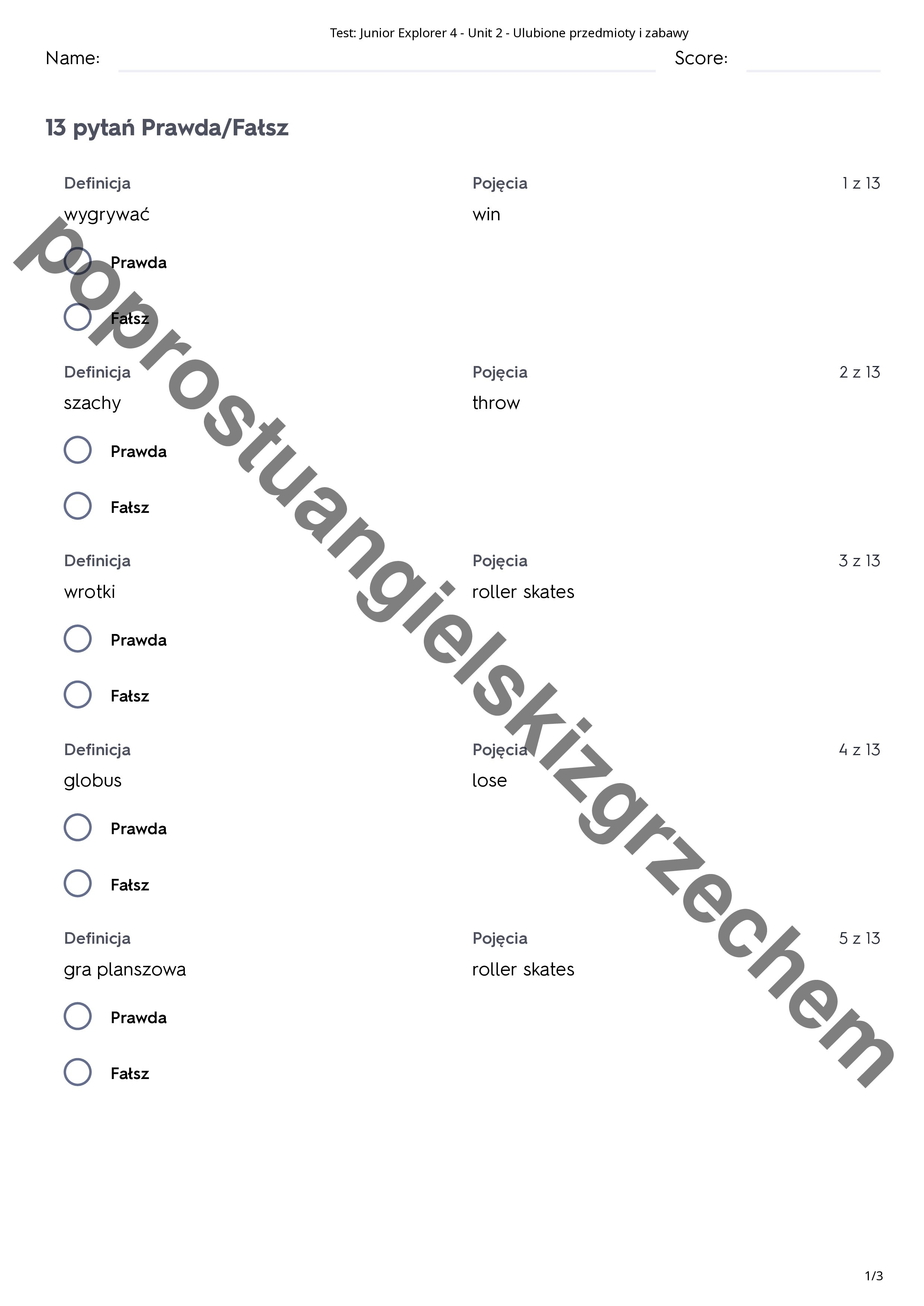 Zestaw zawiera 45 słówek z działu drugiego do podręcznika Junior Explorer 4. Testy podzielone są na 3 podrozdziały, a każdy z nich na 4 kategorie zadań (prawda/fałsz, dopasuj, wielokrotny wybór, pisemny)