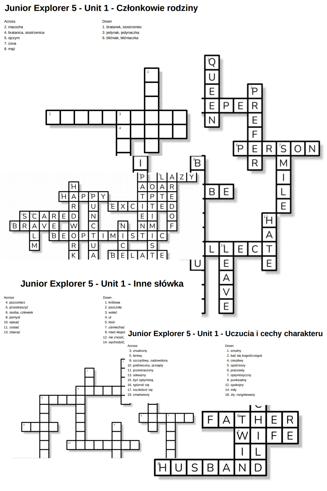 Zestaw zawiera 3 krzyżówki obejmujące słówka z działu pierwszego do podręcznika Junior Explorer 5:
