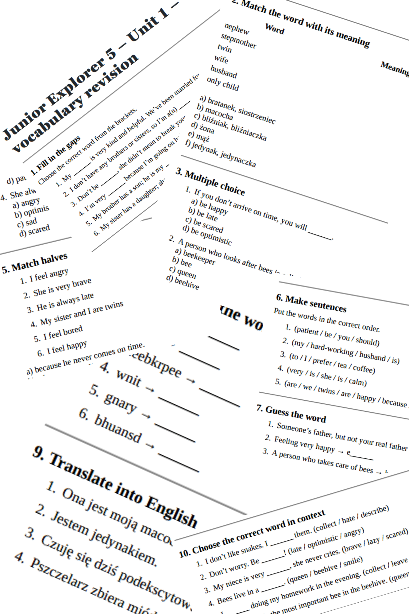 Dziesięć zadań na słownictwo do działu pierwszego z podręcznika Junior Explorer 5. Słownictwo z działu pierwszego w postaci karty pracy tutaj, w postaci testów tutaj, a w postaci krzyżówek tutaj. Niniejsze zadania możesz wykorzystać do przeprowadzenia powtórki, kartkówki lub do utrwalenia materiału ze słownictwa.