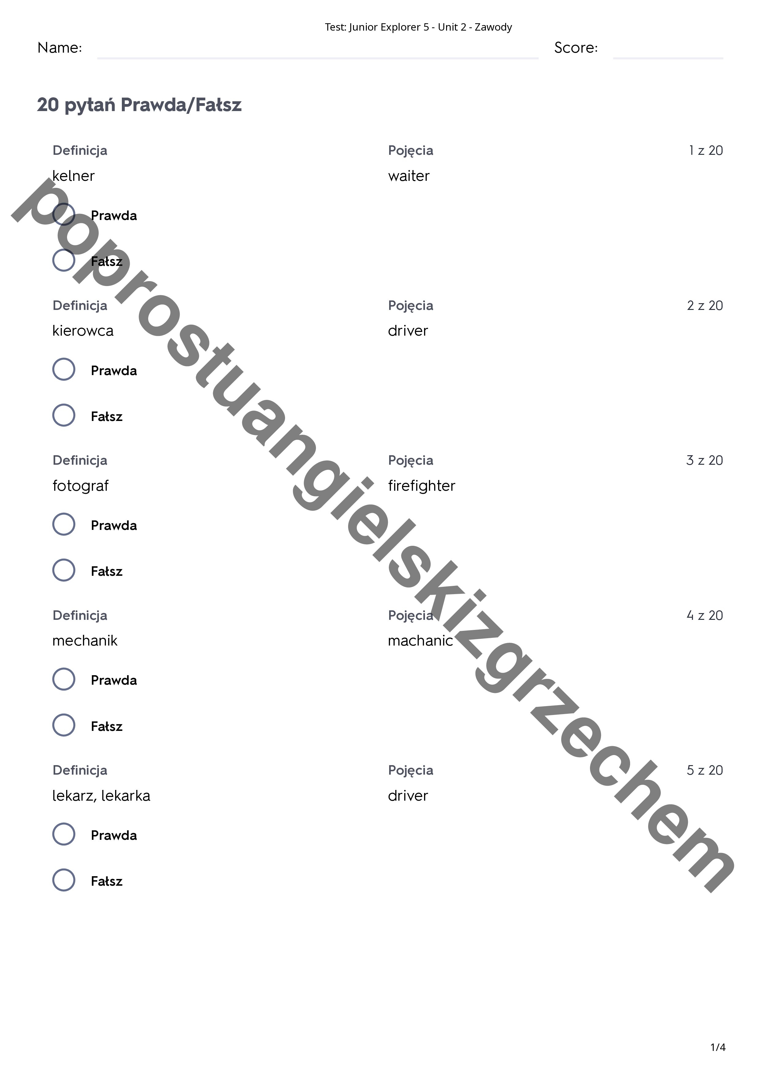 Zestaw zawiera 61 słówek z działu drugiego do podręcznika Junior Explorer 5. Testy podzielone są na 3 podrozdziały, a każdy z nich na 4 kategorie zadań (prawda/fałsz, dopasuj, wielokrotny wybór, pisemny)