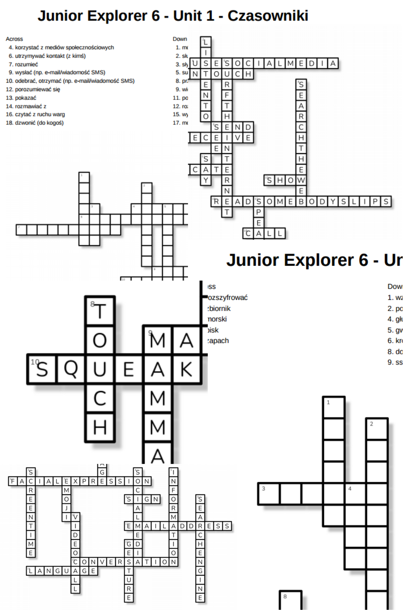 Zestaw zawiera 4 krzyżówki obejmujące słówka z działu pierwszego do podręcznika Junior Explorer 6: