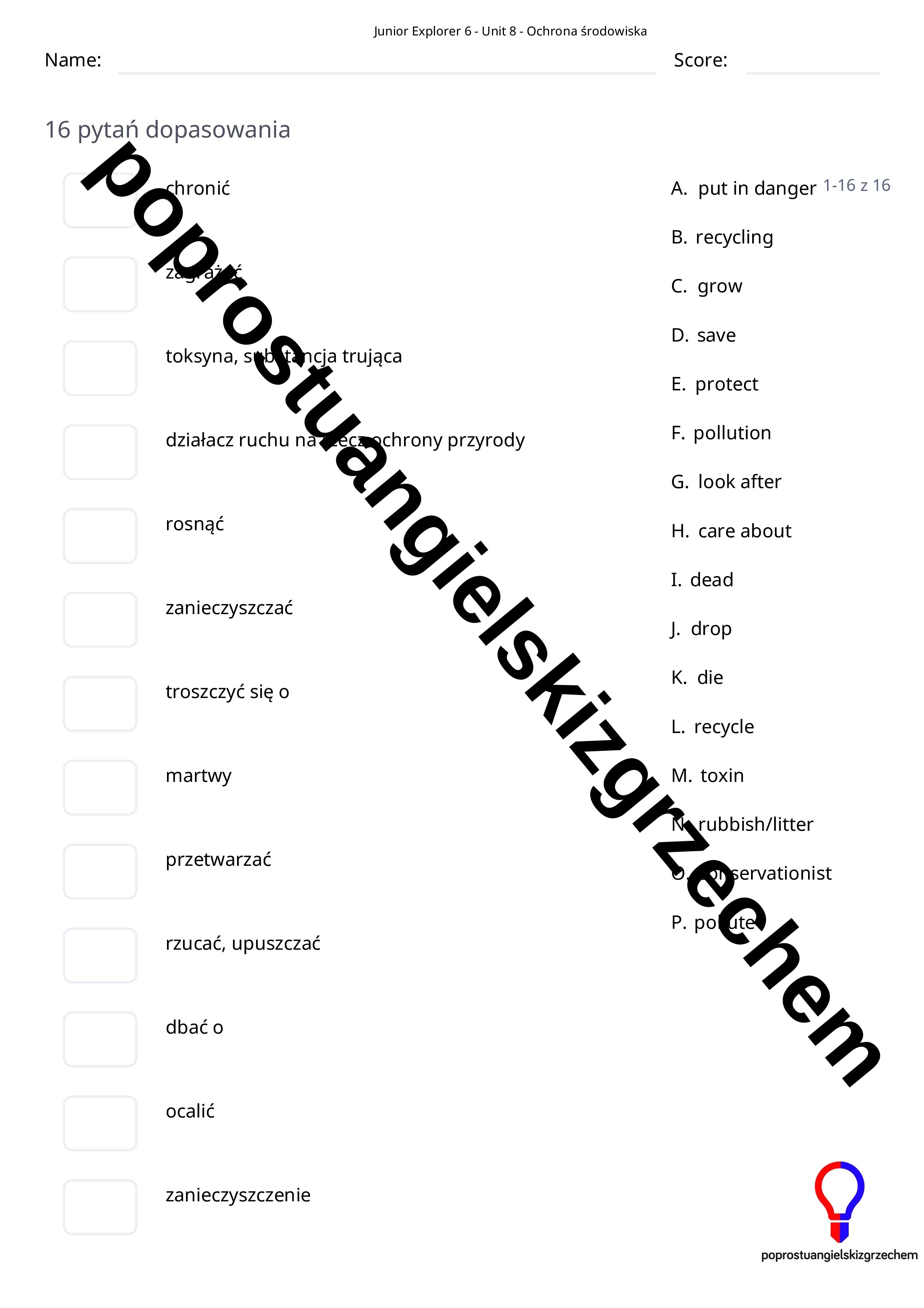 Zestaw zawiera 65 słówek z działu ósmego do podręcznika Junior Explorer 6. Testy podzielone są na 5 podrozdziałów, a każdy z nich na 4 kategorie zadań (prawda/fałsz, dopasuj, wielokrotny wybór, pisemny)