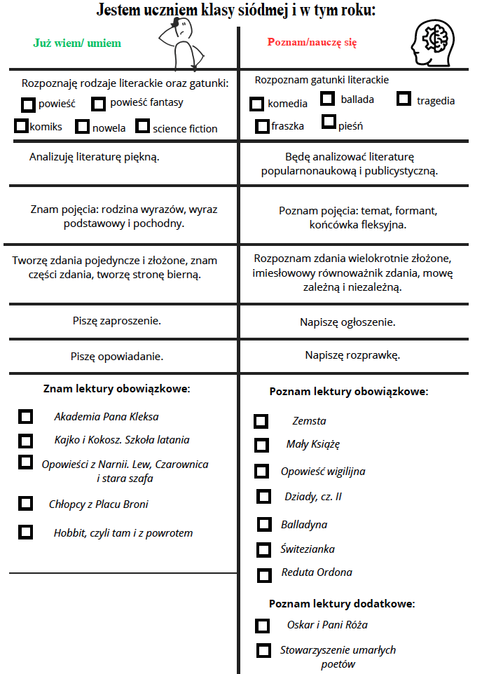 Wklejka dla ucznia, którą można rozdać na pierwszej lekcji języka polskiego. Zawiera spis najważniejszych zagadnień poznawanych w klasie 7, w tym lektury obowiązkowe i uzupełniające.