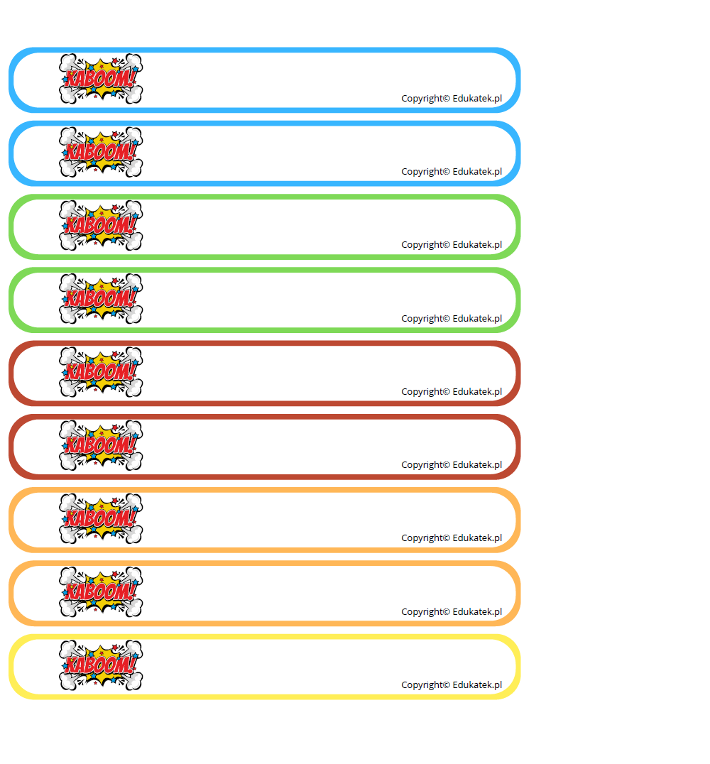Karty drukujemy na sztywnych kartkach lub laminujemy. Wycinamy i wkładamy do pojemnika pytaniami do dołu. Dzieci po kolei losują kartę i wykonują zadanie (np. pokazują emocję, odpowiadają na pytanie, proponują rozwiązanie sytuacji społecznej). Wylosowanie KABOOM oznacza opuszczenie jednej kolejki. Wylosowanie BONUS daje dodatkowe losowanie pytania.