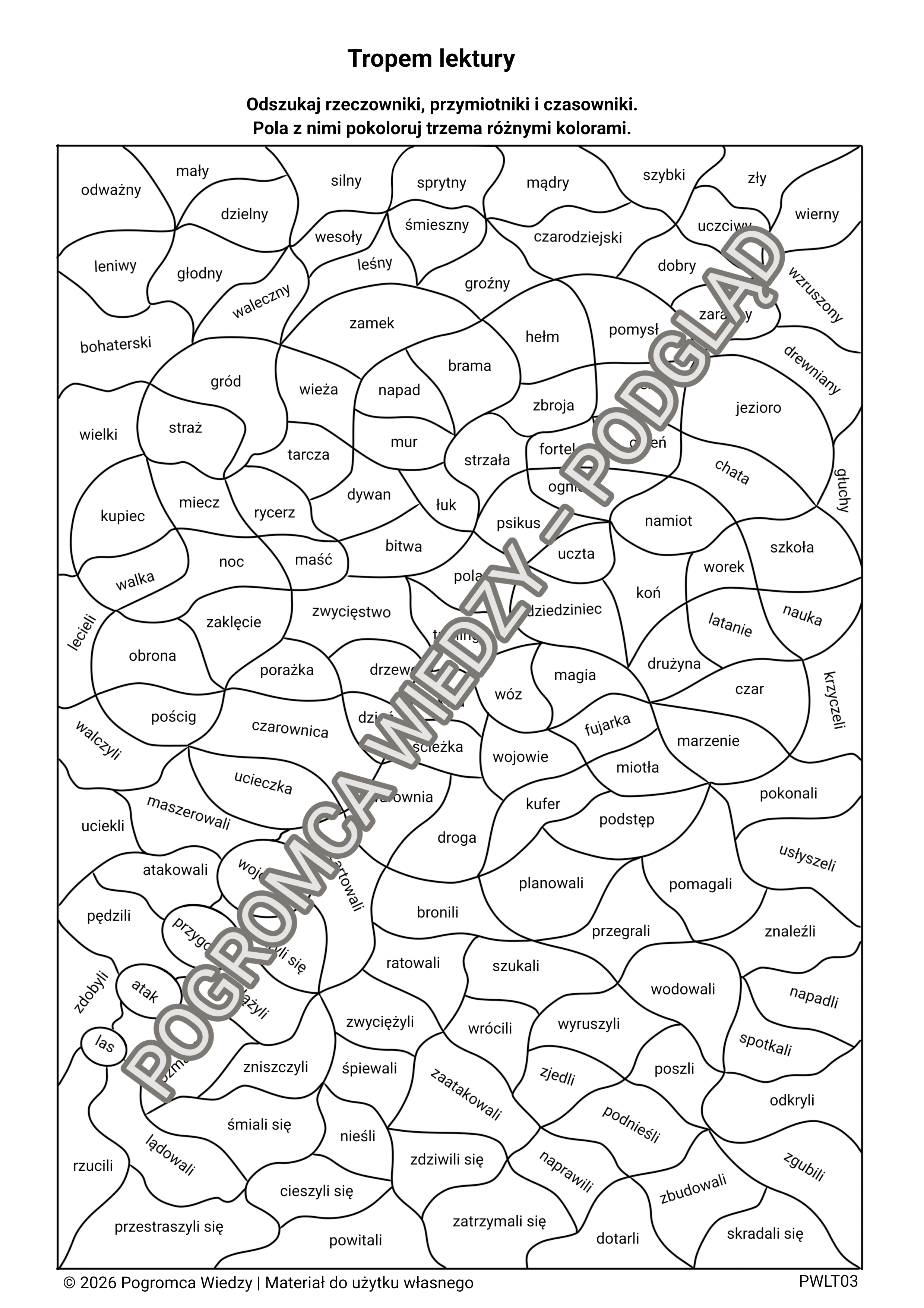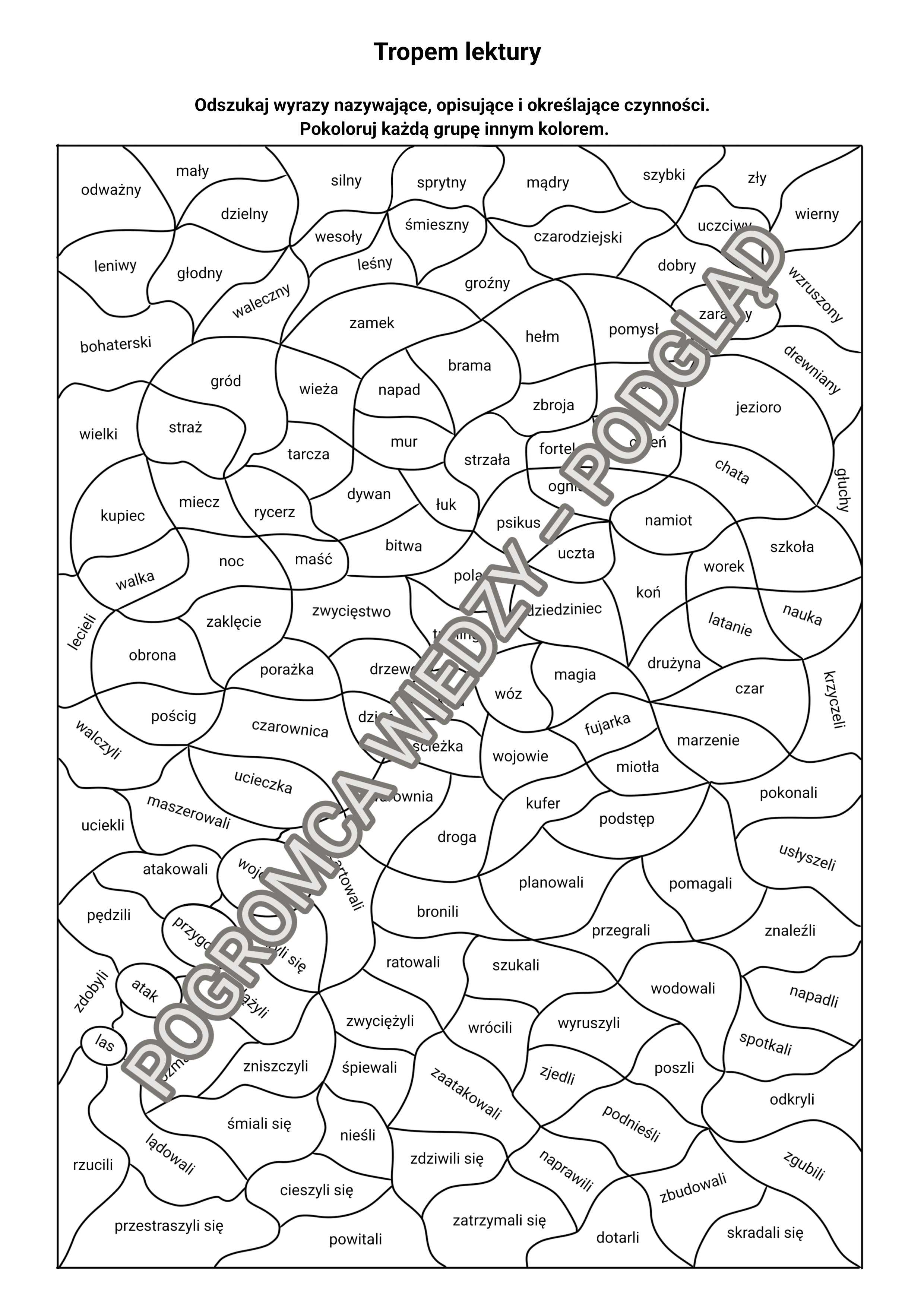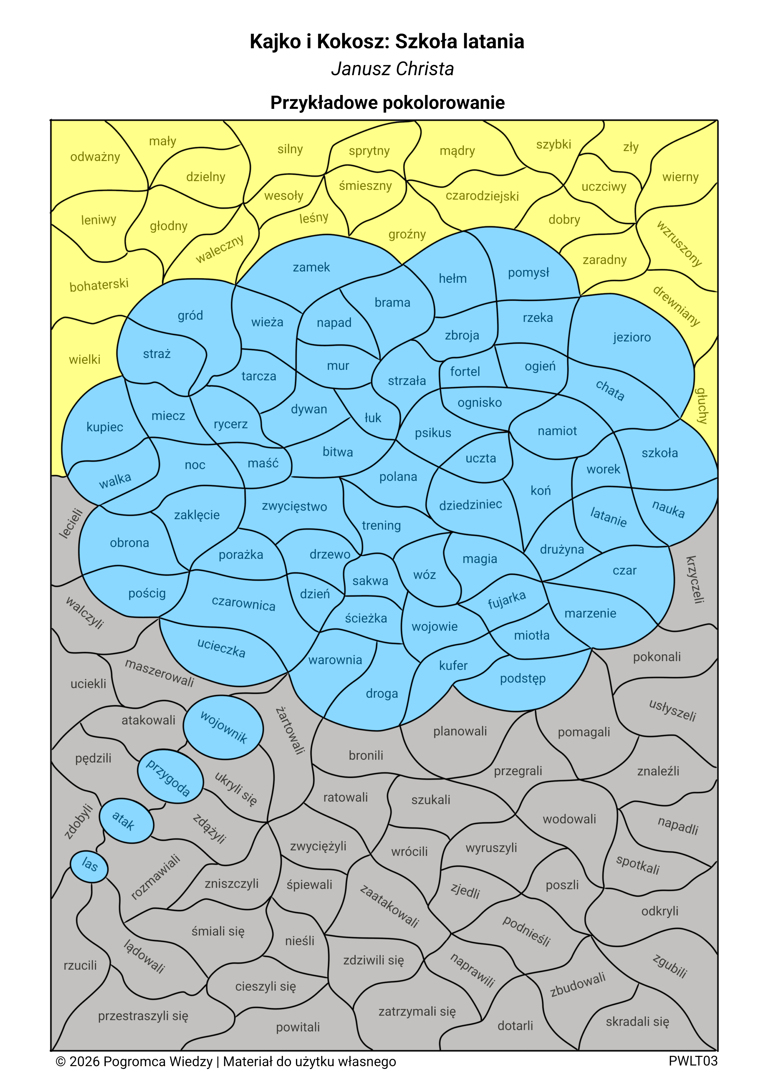 Karta pracy do „Kajko i Kokosz: Szkoła latania” w formie mozaiki. Uczniowie wyszukują wyrazy i przyporządkowują je do odpowiednich grup, a następnie kolorują pola według podanych zasad. Materiał zawiera dwie wersje polecenia: opisową oraz z częściami mowy, dzięki czemu można dopasować poziom zadania do uczniów. Karta świetnie sprawdzi się jako wprowadzenie do lektury oraz ćwiczenie rozpoznawania części mowy.