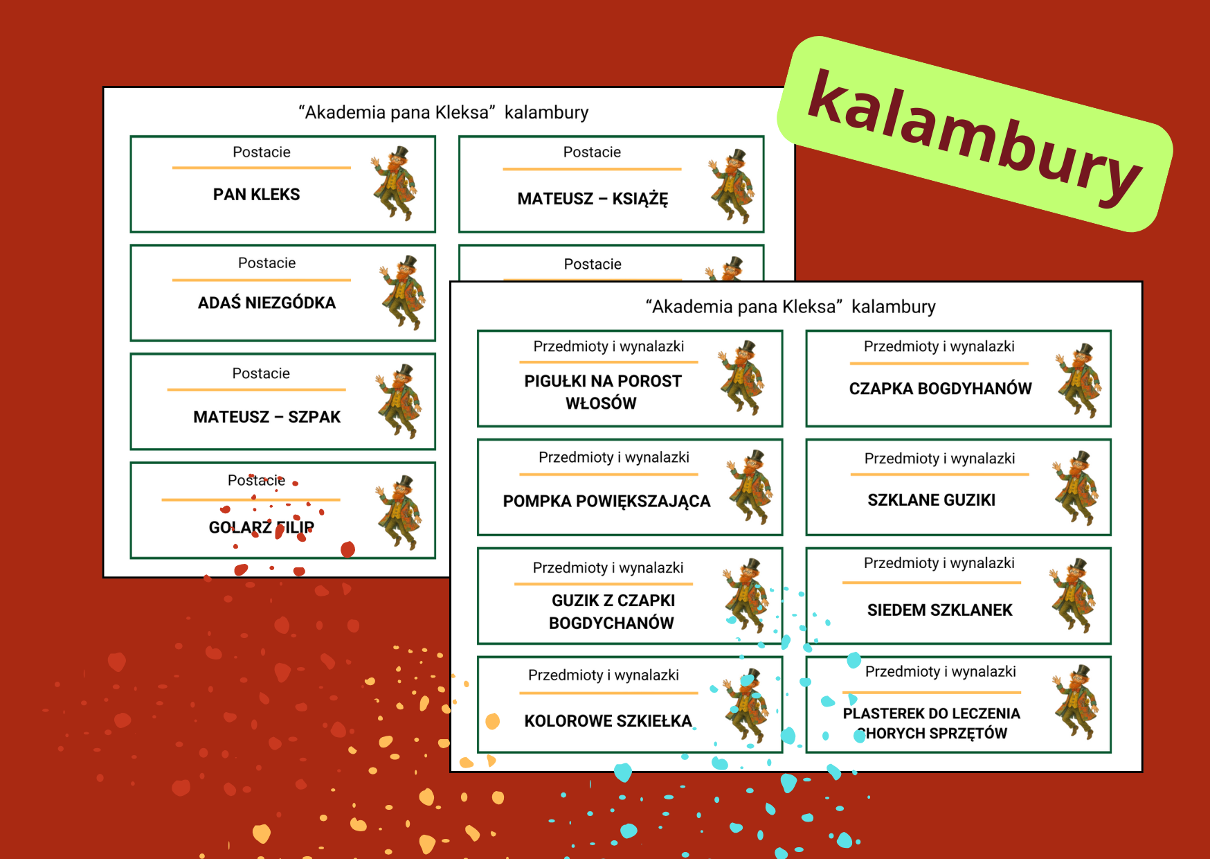 Zestaw kalamburów do książki „Akademia pana Kleksa” Jana Brzechwy, podzielonych na czytelne kategorie tematyczne. Każdy zestaw zawiera hasła, które uczniowie mogą pokazywać lub rysować – idealne na lekcje języka polskiego lub zabawy biblioteczne.