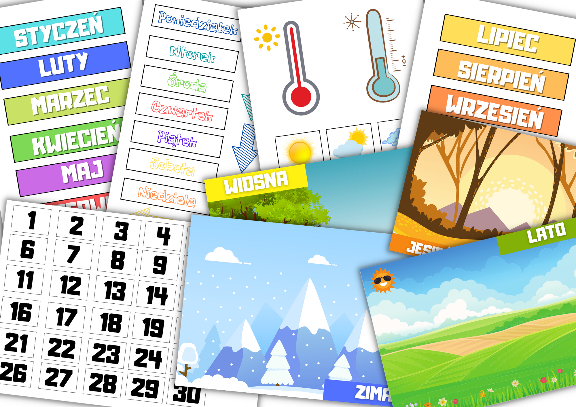 Materiały do stworzenia własnego kalendarza. Można zrobić go na dużym formacie, aby dzieci codziennie mogły zmieniać datę, ustalać pogodę oraz temperaturę. Jest to także świetny sposób na naukę dni tygodnia, miesięcy, pór roku. Polecam!
