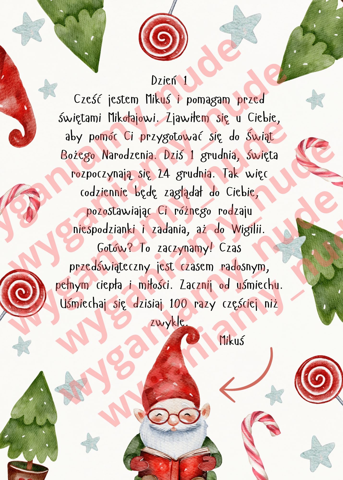 Każdego dnia dziecko musi wykonać pewne zadanie. Pomocnik Mikołaja, Mikuś, podpowiada co trzeba zrobić. Czasem chowa drobne prezenty, czasem pozostawia rzeczy potrzebne do wykonania konkretnego zadania.