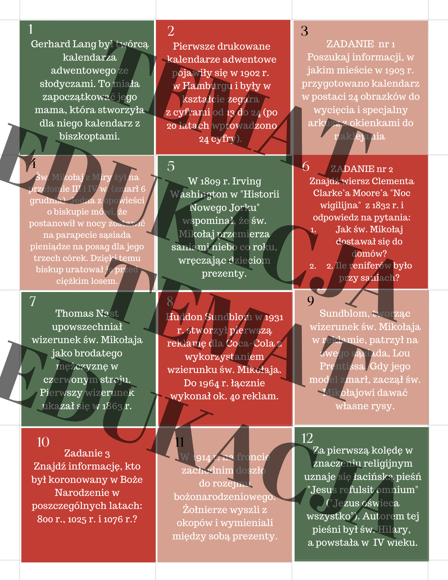 Proponujemy kalendarz adwentowy związany z ciekawostkami historycznymi i zadaniami. Uczniowie mogą rozwiązywać zadania, a później możemy ich nagrodzić.