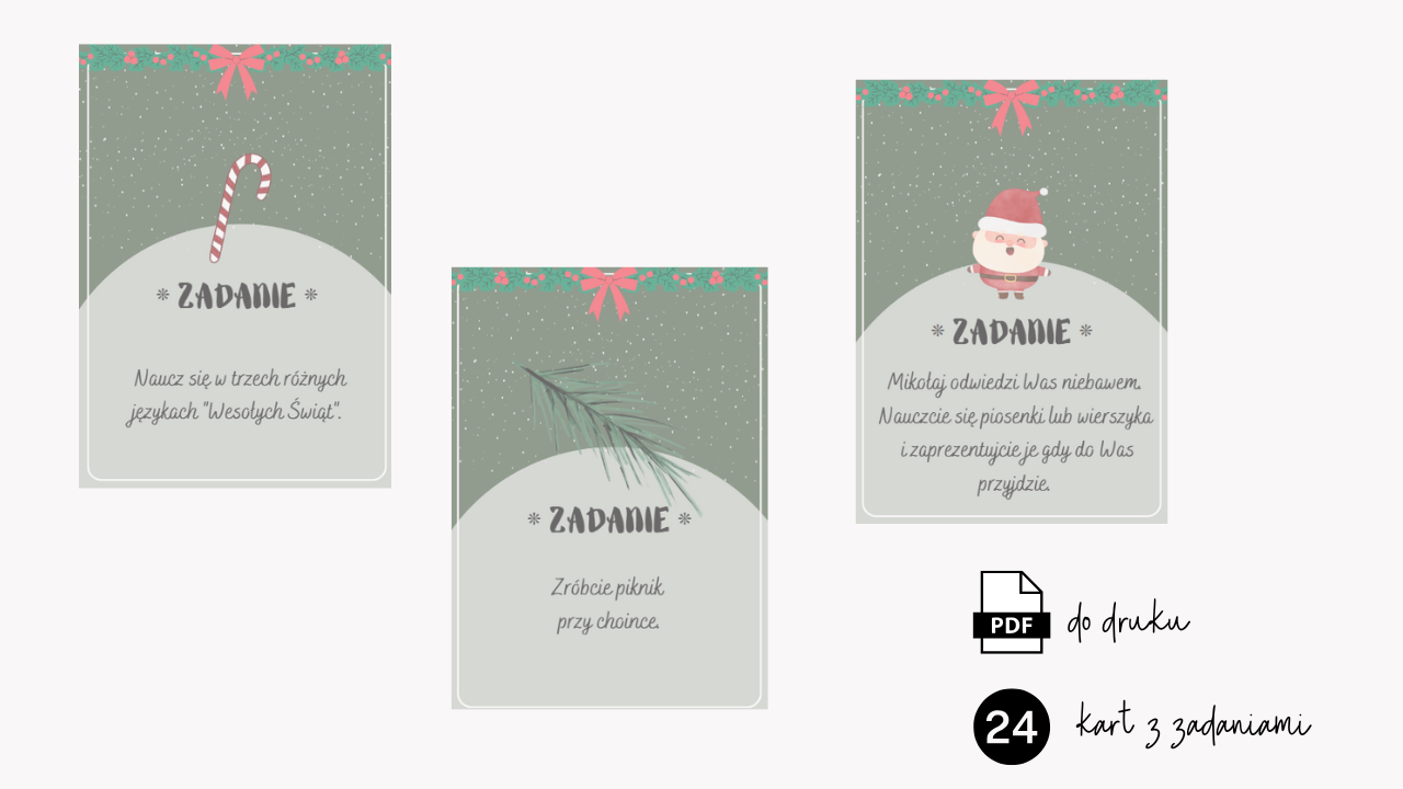 Plik zawiera 24 zadania do kalendarza adwentowego, np. zróbcie świąteczne kartki, nauczcie się w trzech różnych językach "Wesołych świąt".