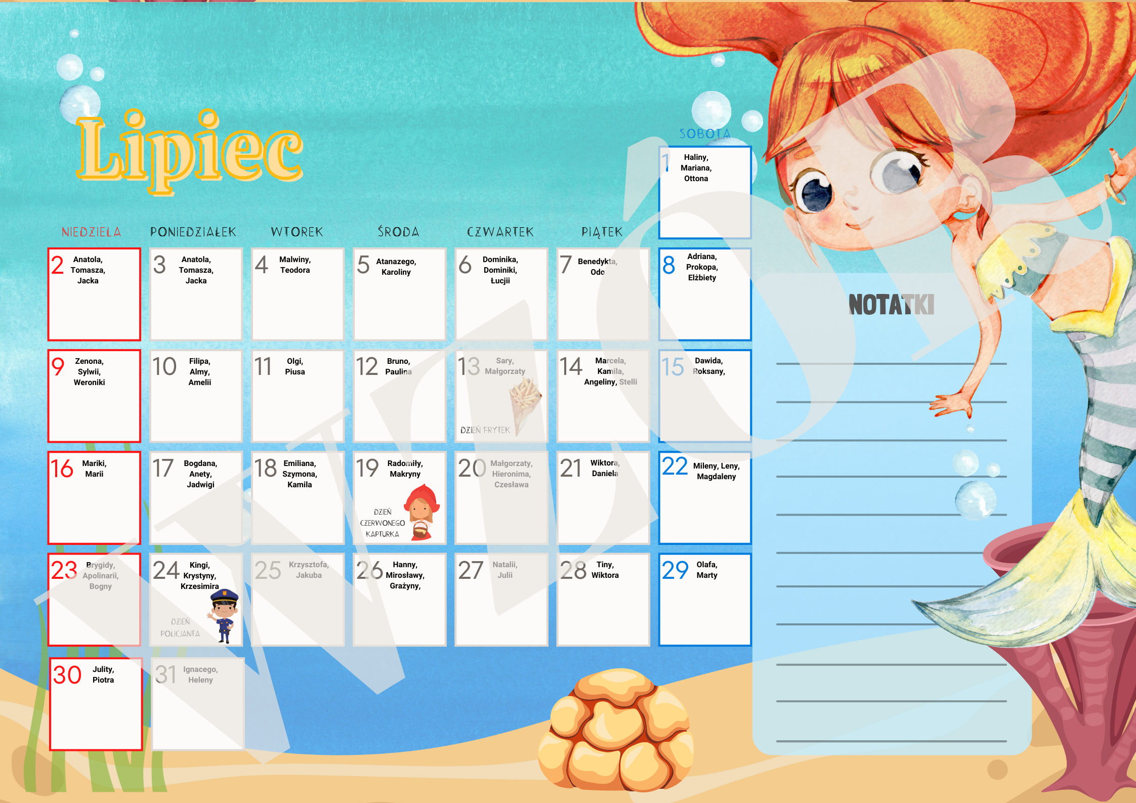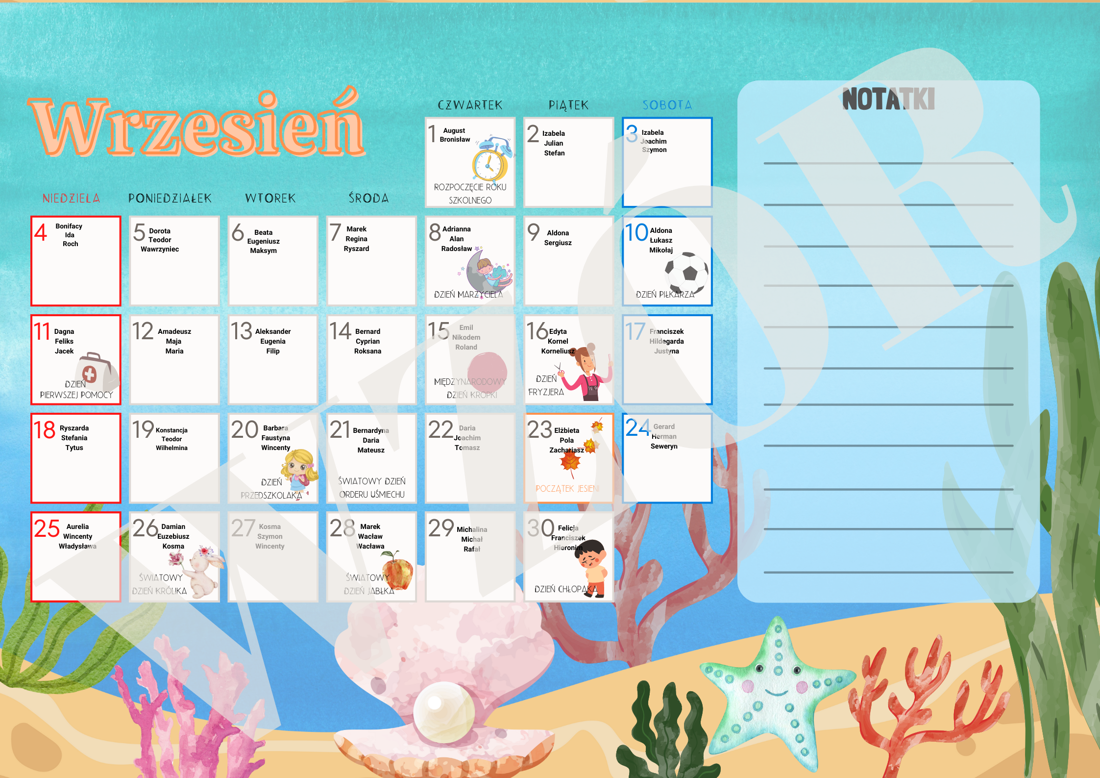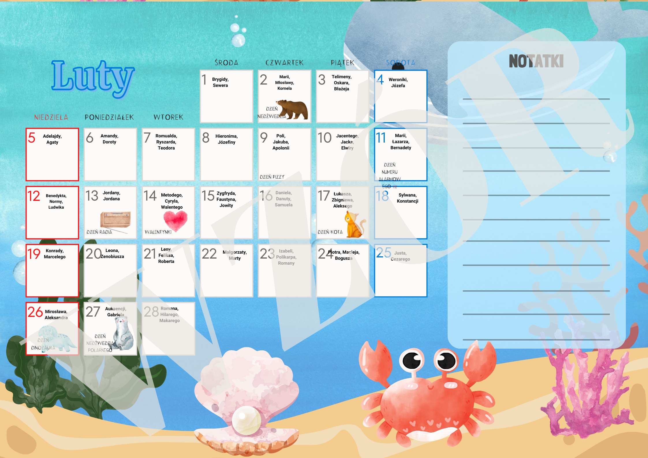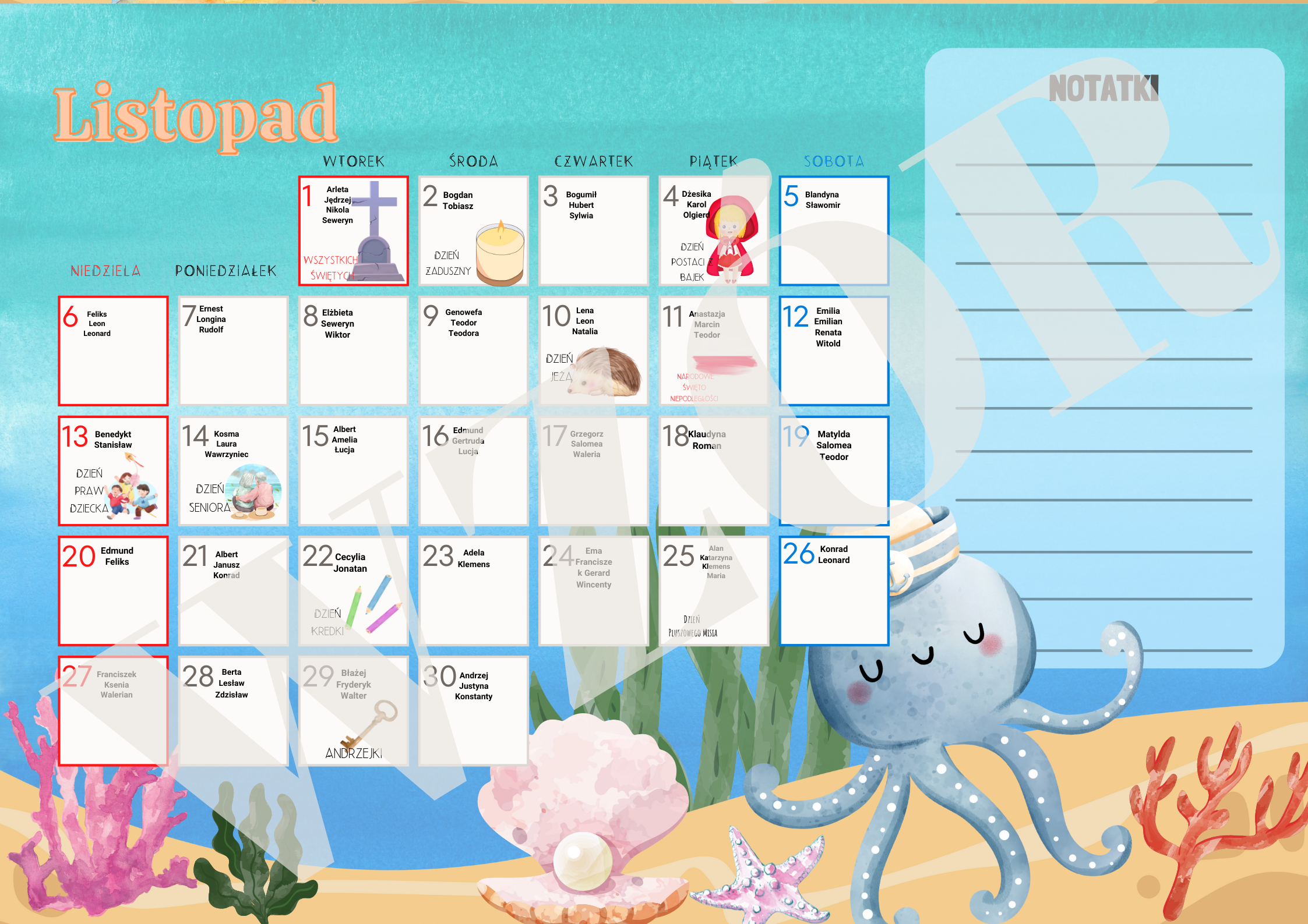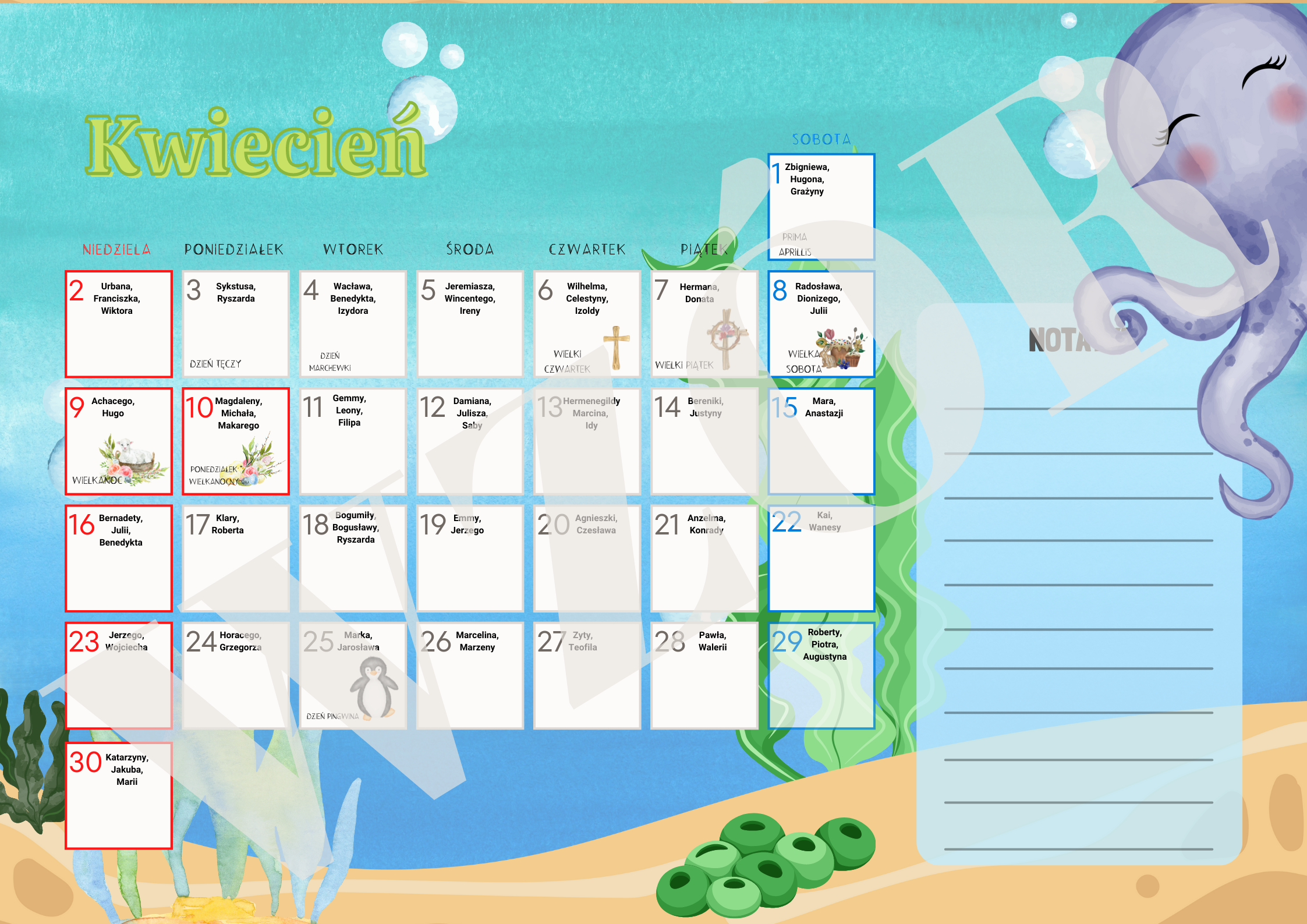 Kalendarz dni nietypowych w formie pdf do wydruku, w tematyce podwodnej, zawiera propozycje dni i świąt nietypowych, które można obchodzić wspólnie z uczniami lub z dzieckiem w domu.