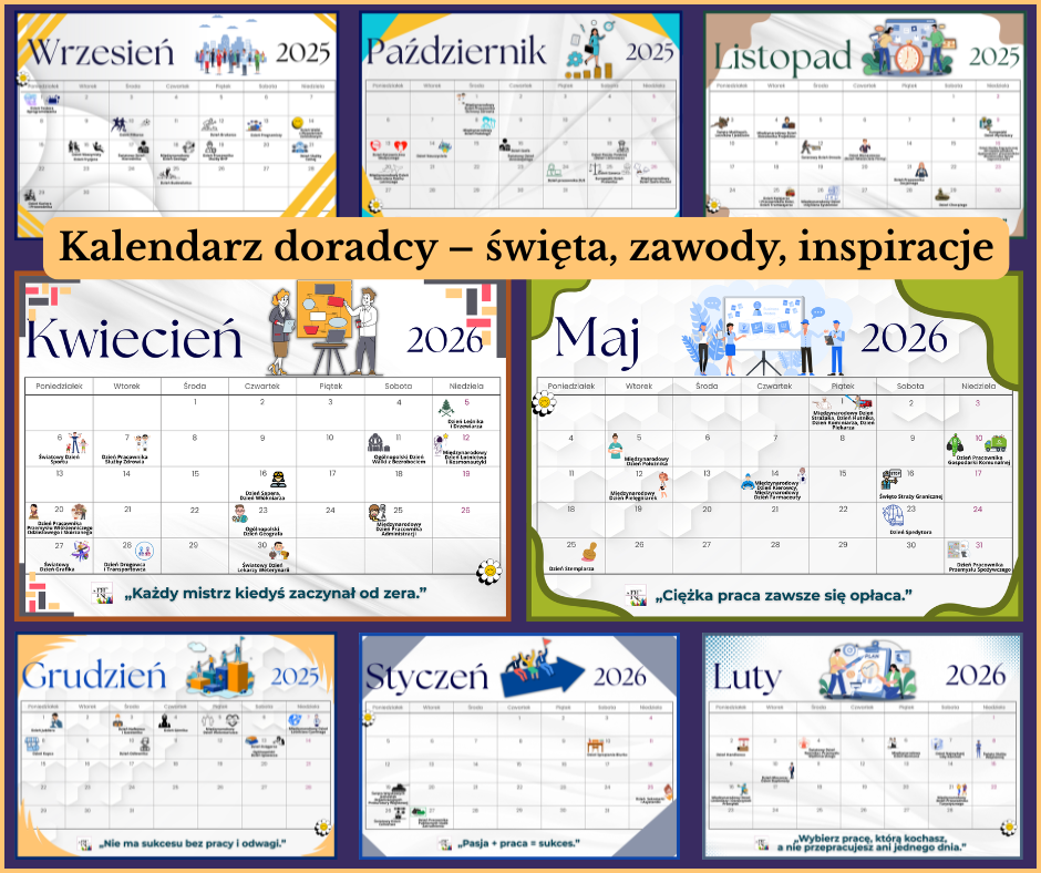 Kalendarz Doradcy – Święta, Zawody, Inspiracje to wyjątkowe narzędzie stworzone z myślą o osobach pracujących w obszarze doradztwa zawodowego, edukacji oraz planowania kariery.