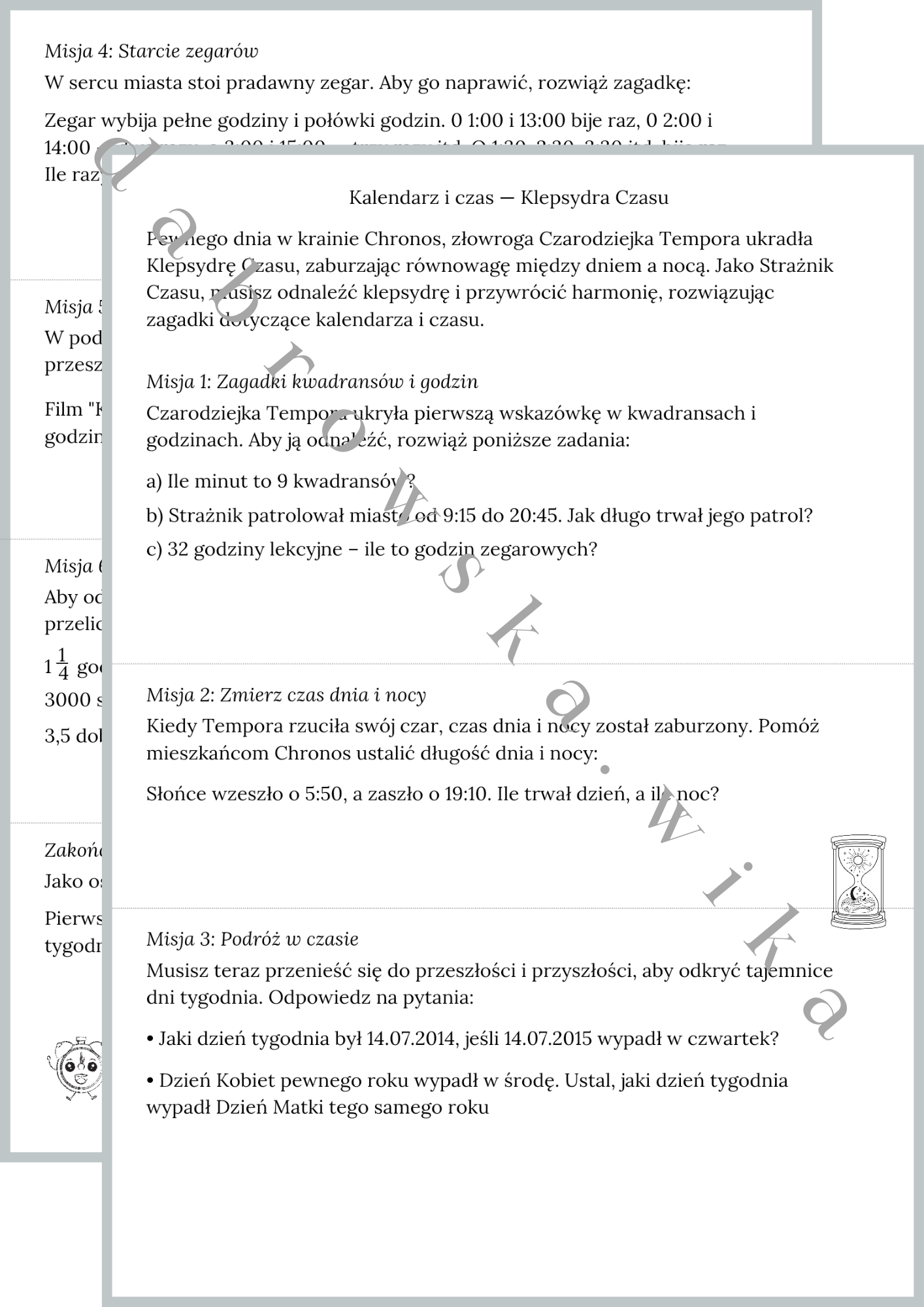 Uczniowie wcielają się w rolę Strażnika Czasu, który musi rozwiązać szereg zagadek, aby odnaleźć skradzioną Klepsydrę Czasu. Karta pracy składa się z sześciu misji, w tym zagadek związanych z kwadransami i godzinami, długością dnia i nocy, podróżami w czasie oraz przeliczeniami jednostek czasu.
