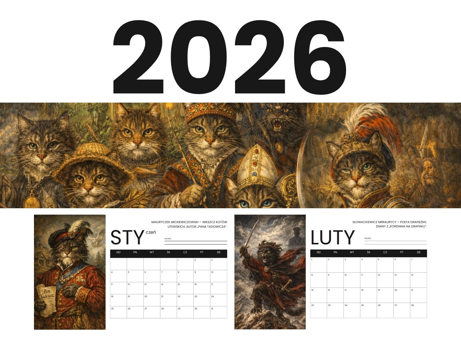 Czego potrzebuję w roku 2026? Literatury… miau i pazura! Przed Wami „Kalendarz Mrau Mrau Literacki 2026” – najdowcipniejszy poczet kocich wieszczów i fraszkomistrzów inspirowany stylem Matejki. Otwierając każdy miesiąc, poznacie: - Miauryczka Mickiewiczowskiego - Słowackiewicza Mrraurycego - Kocchanowskiego Kochanowłaskiego - Prusiaczka Pazurpawsa - Sienkotkiewicza Litwosława - Reymurkota Reymontowskiego - Krasickiewicza Bajkomraua - Fredziaka Fredomiaua - Żeromruczka Żeropazura - Norwisję Norwdziora - Orzeszkotkę Orzeszkoczek - Wyspiakociego Wyspiamiaua Każdy portret to majstersztyk z literackimi aluzjami i kocim humorem – idealny na ścianę klasy, biblioteki domowej czy kociego tronu! Dla kogo? Poloniści, nauczyciele, studenci filologii, kociarze z książką w łapie i wszystkie miłośniczki literatury z wąsami na pewno go pokochają. To świetny prezent na Dzień Nauczyciela, święta czy urodziny polonistki! Twoje poddasze zasługuje na kocich wieszczów! 🐱📚 Format: 16:9. Ważna informacja: tydzień zaczyna się od dnia, który koty lubią najbardziej, czyli od NIEDZIELI! Elementy graficzne zostały wygenerowane przez sztuczną inteligencję.