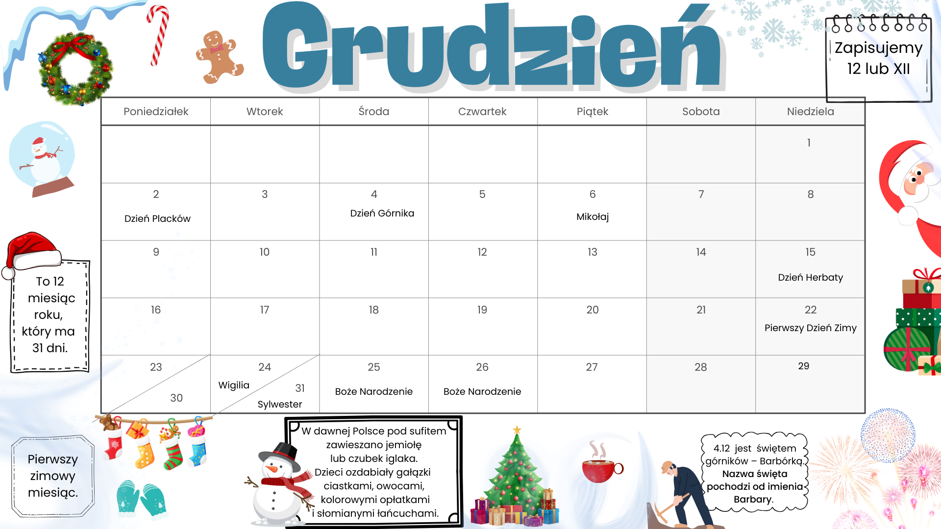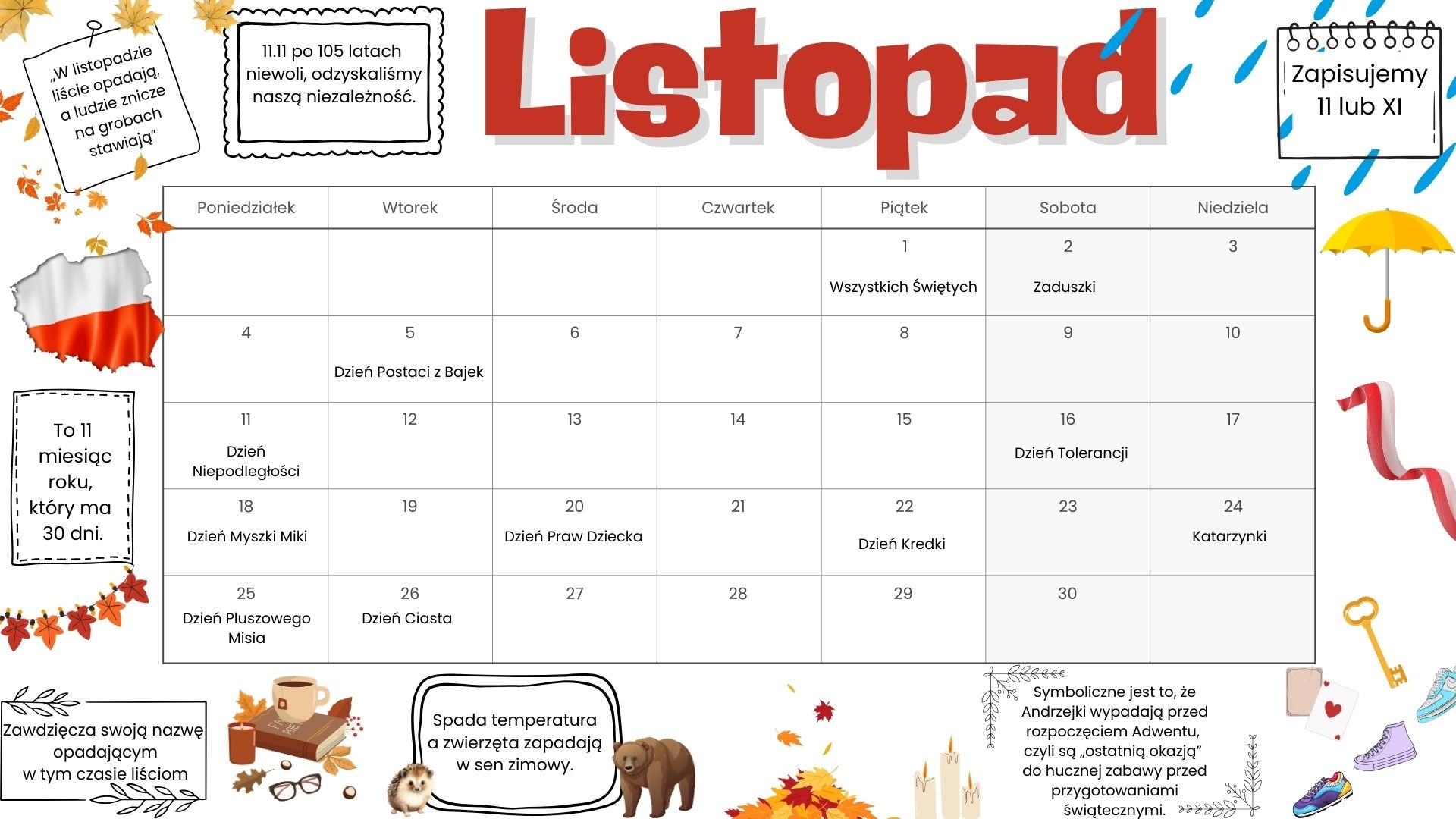 Kalendarz zawiera święta nietypowe oraz informacje o danym miesiącu. Każdy miesiąc na osobnej kartce.