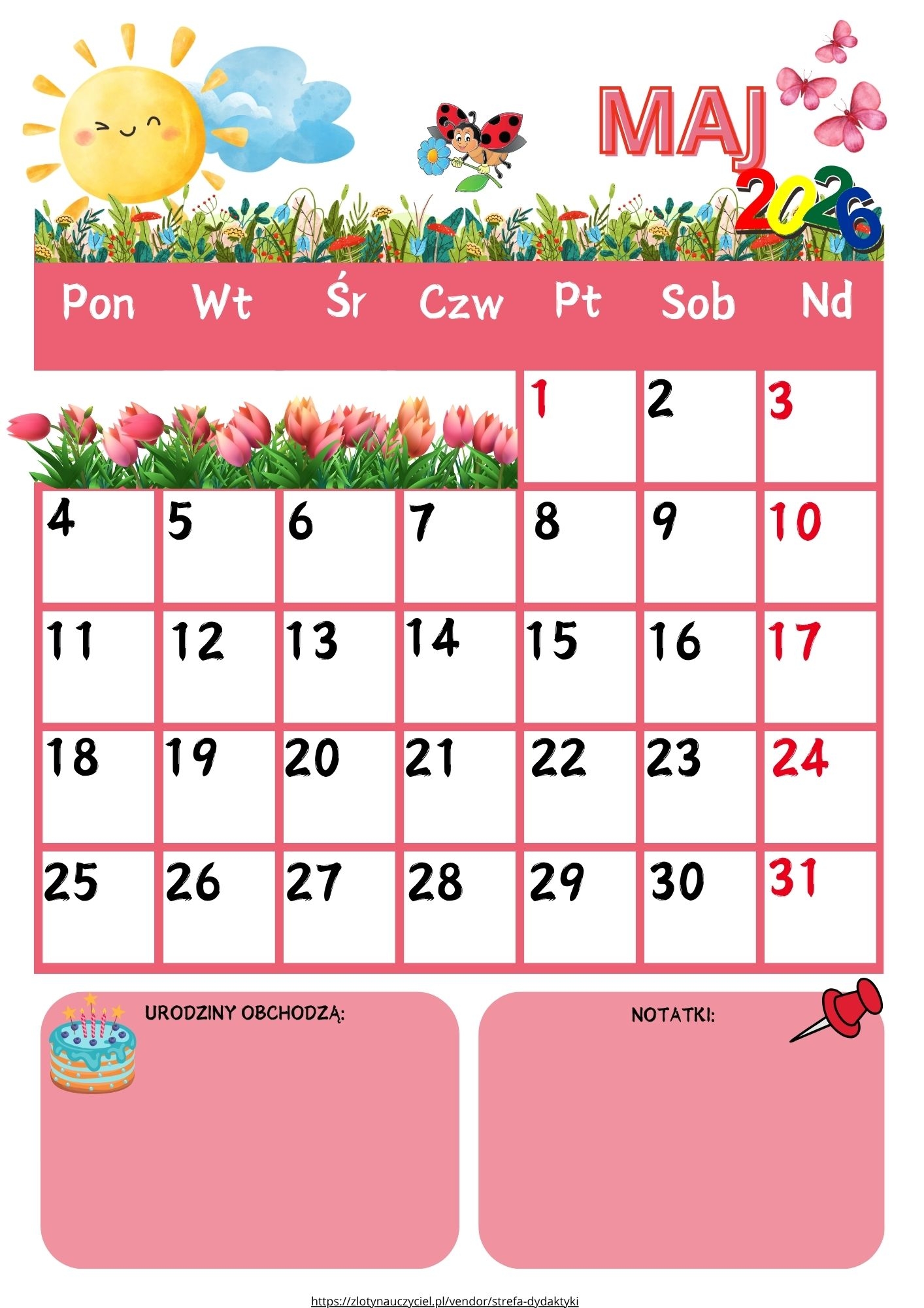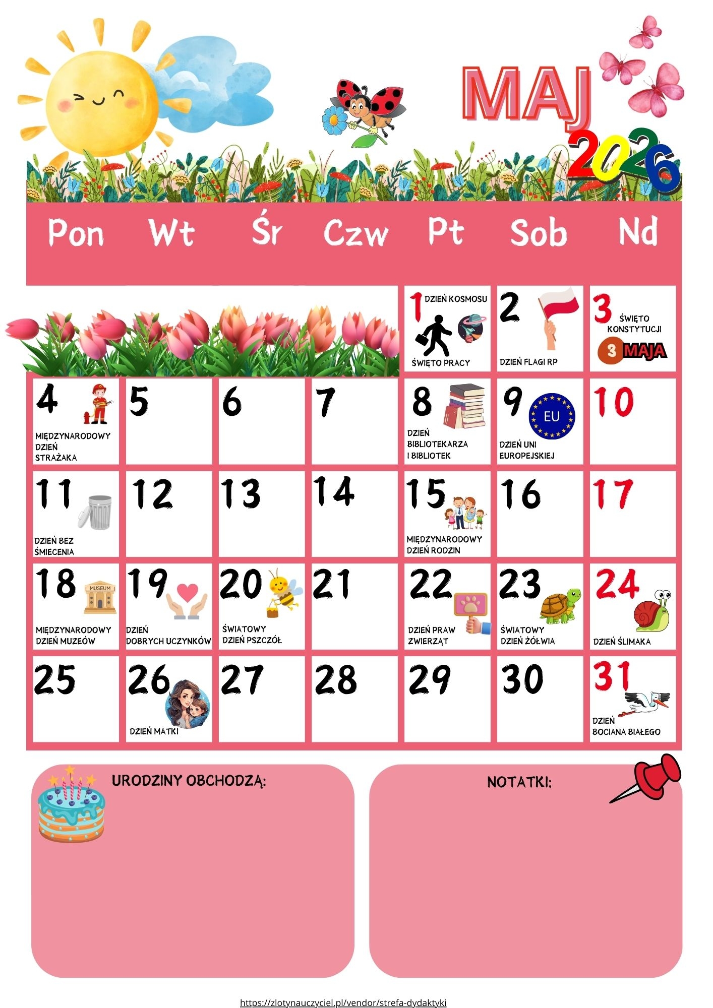 Kalendarz świąt typowych i nietypowych na rok szkolny 2025/2026 - w wersji pionowej. Na każdej karcie dodatkowe miejsce na wpisanie urodzin oraz własnych notatek. Dwie wersje - wypełniona oraz pusta.