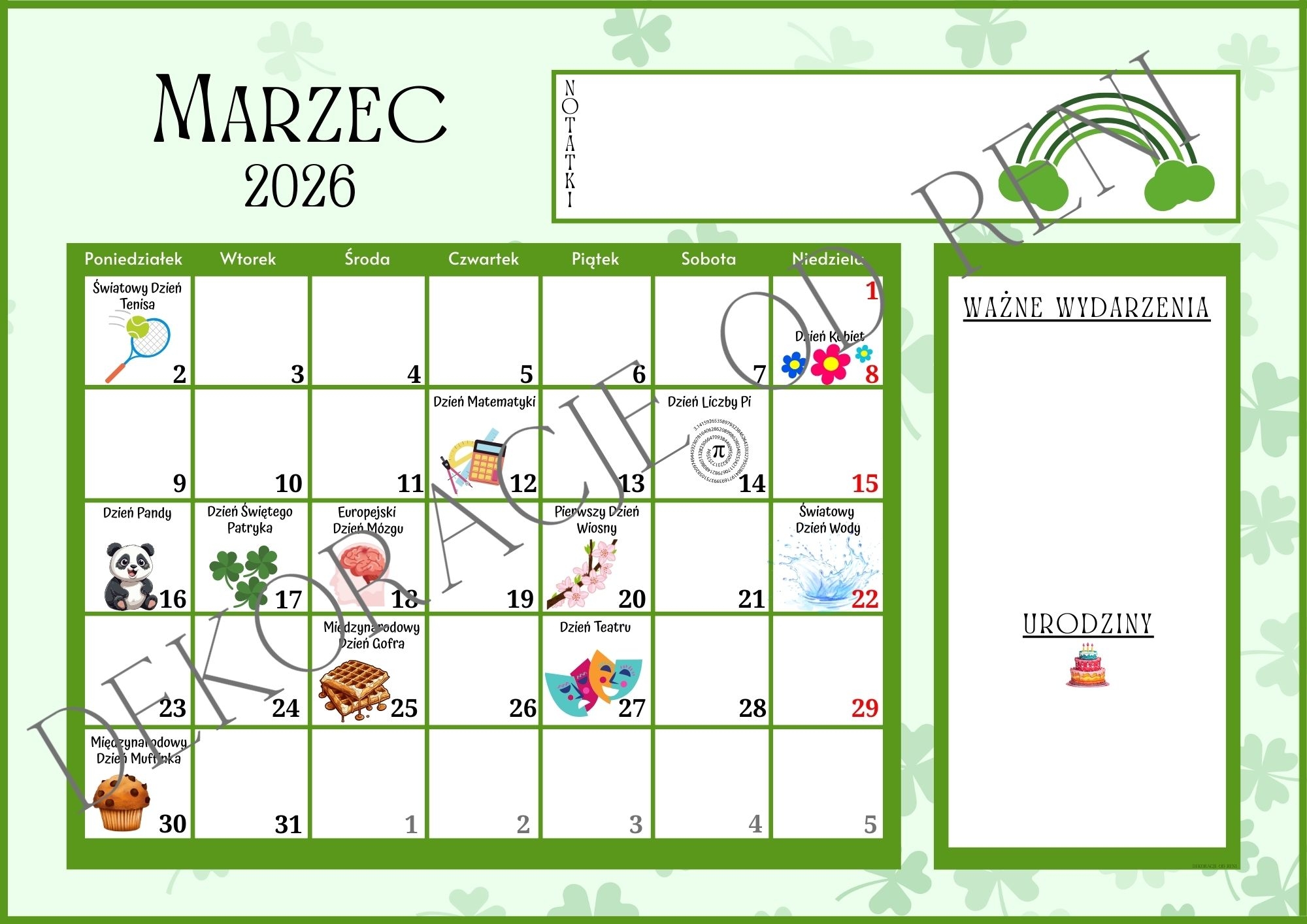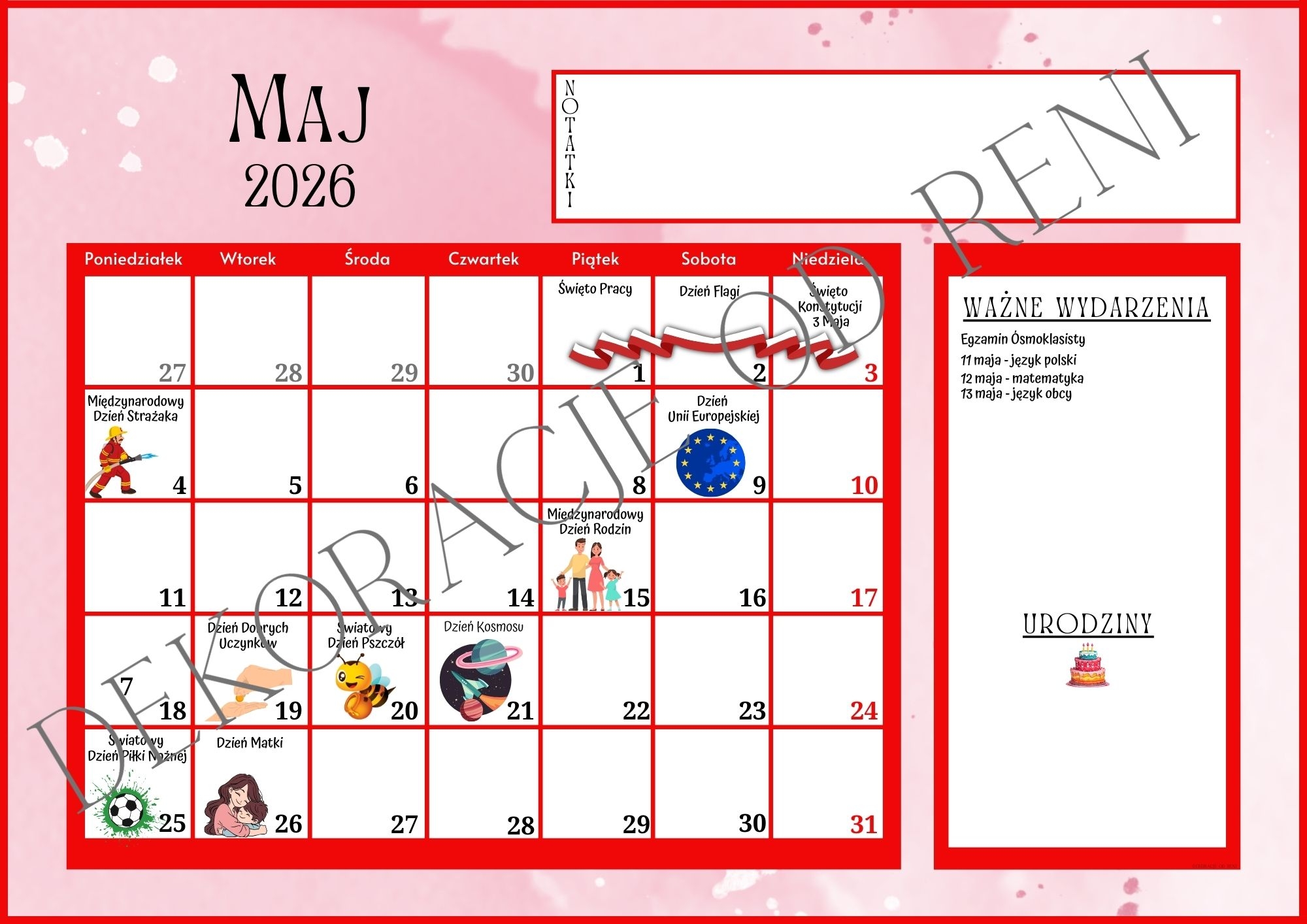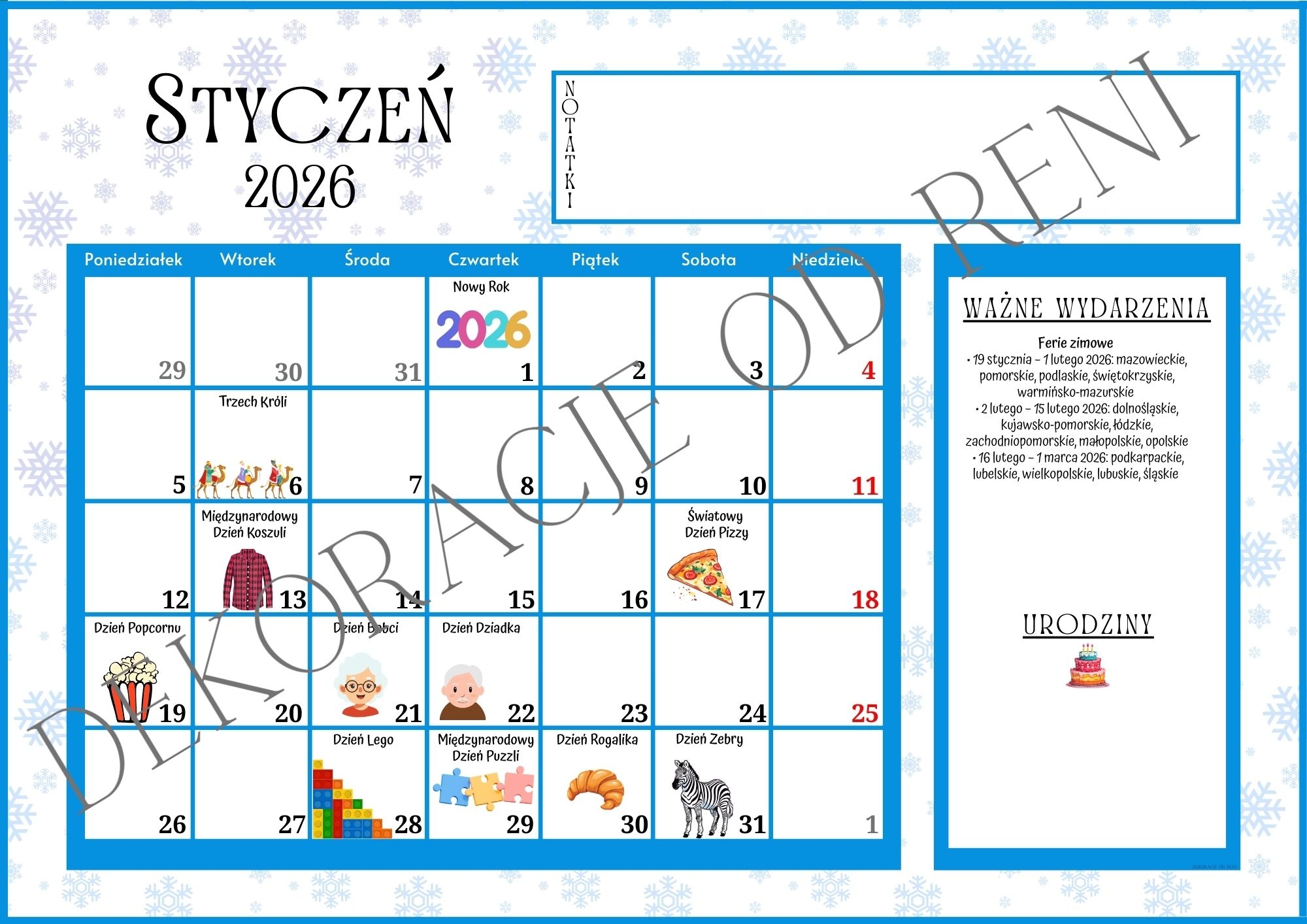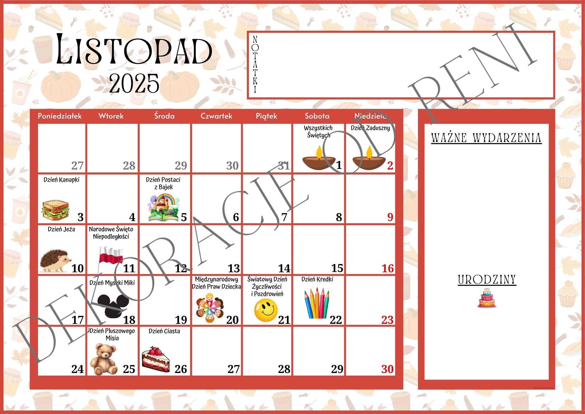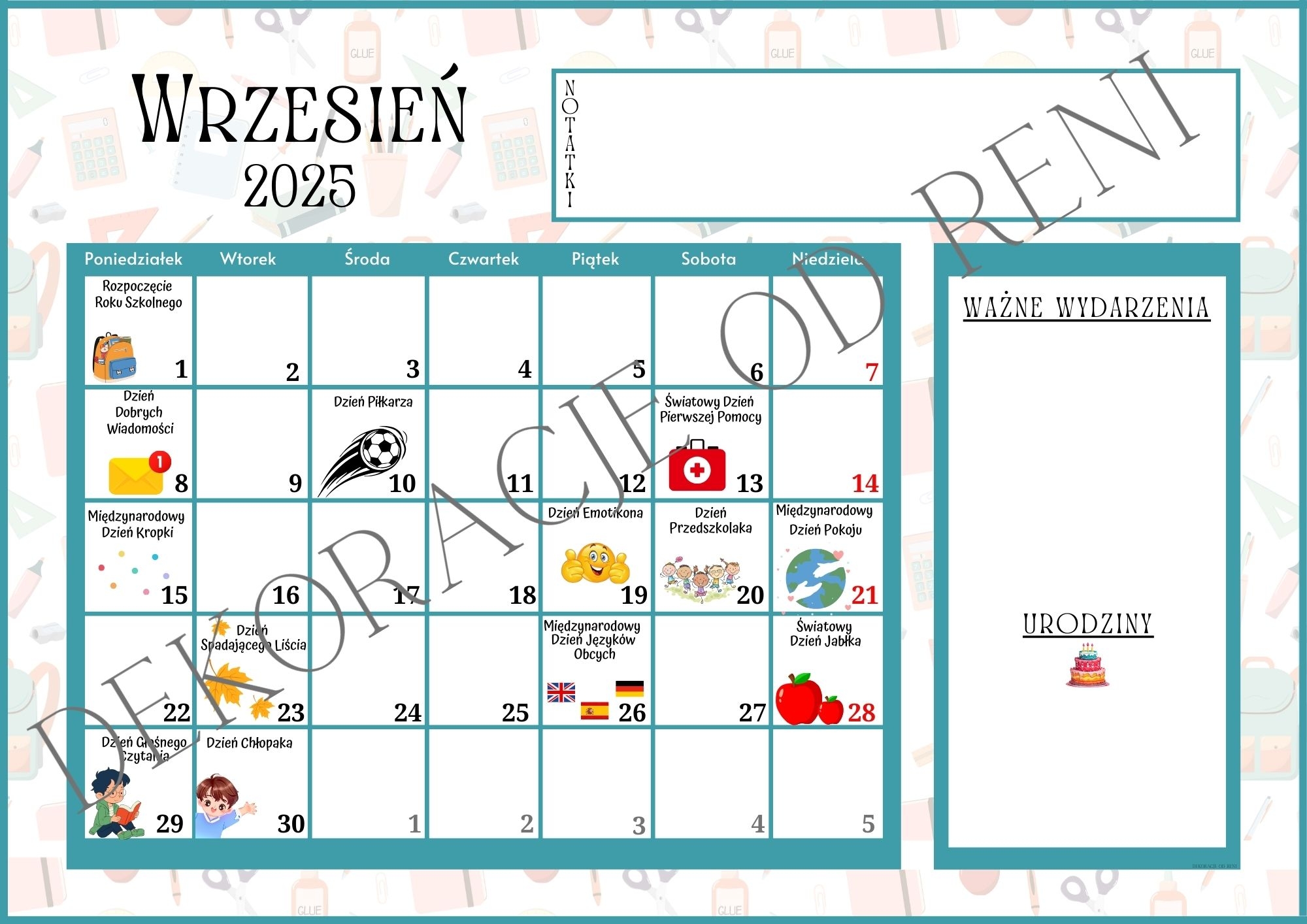 Kalendarz Szkolny 2025/2026 to zestaw 12 kart A4 w formacie pdf. W kalendarzu wpisane są święta i dni nietypowe, tak chętnie celebrowane w szkole. Warto więc być na bieżąco. Na kartkach poszczególnych miesięcy jest wydzielone miejsce na wpisanie ważnych wydarzeń, urodzin i notatek. Zamieszczone są również informacje dotyczące przerw świątecznych i ferii.