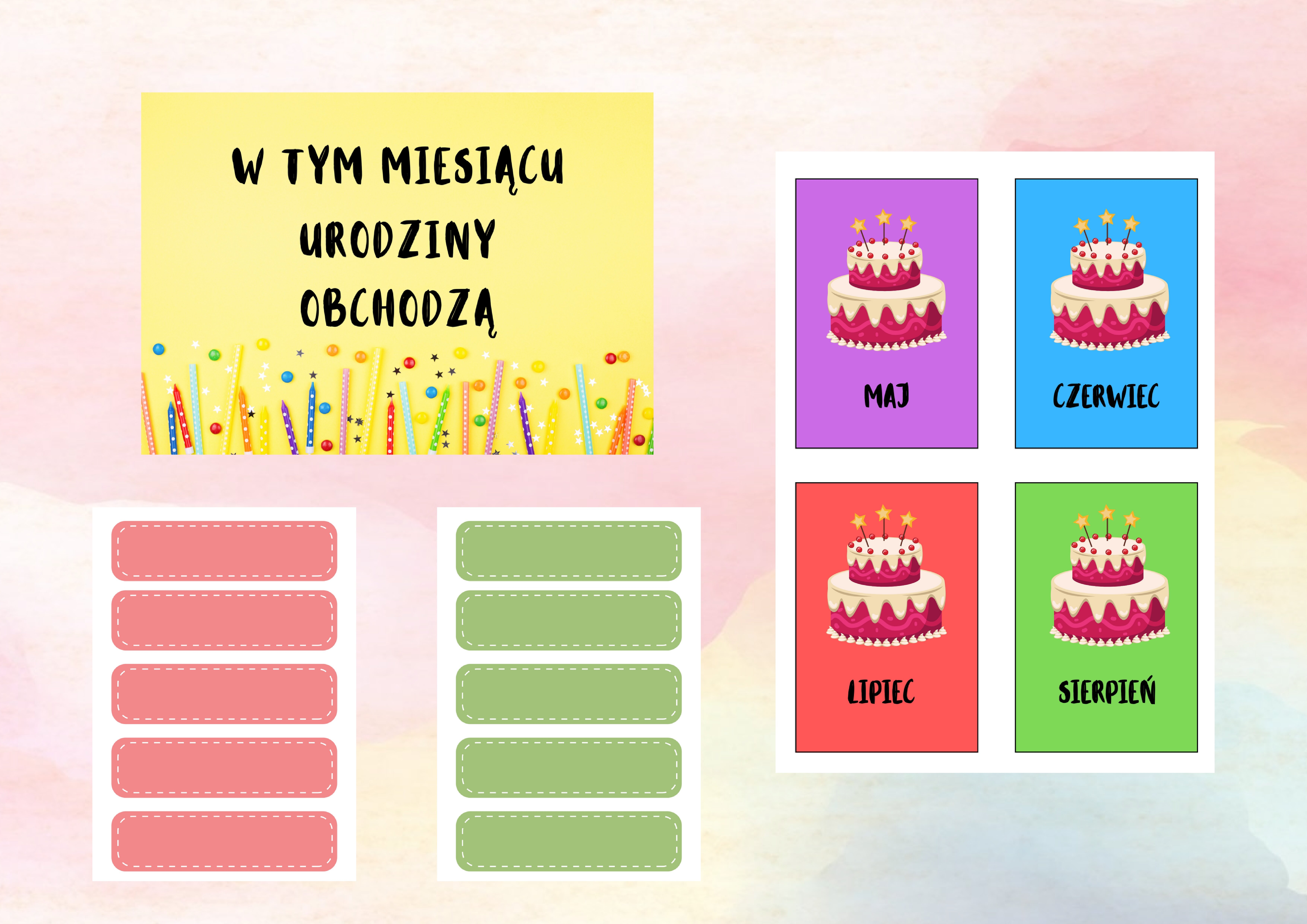 Kalendarz urodzinowy do zawieszenia w klasie. Zawiera planszę z napisem " W tym miesiącu urodziny obchodzą", trzy plansze z nazwami miesięcy (po cztery na stronie) oraz zestaw kolorowych karteczek do wpisywania imion uczniów.
